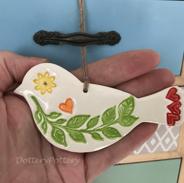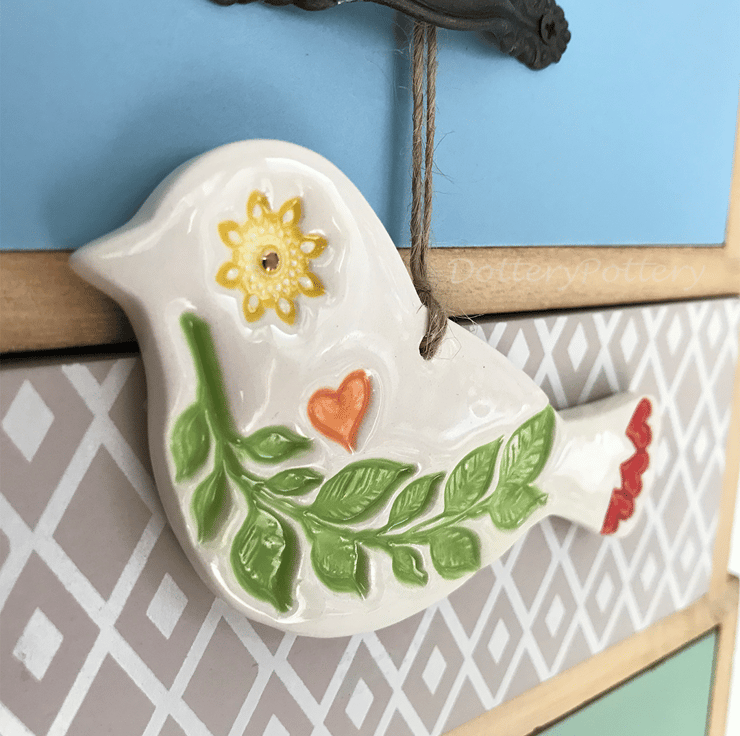 This cute little pottery bird has been hand-cut from white earthenware clay, decorated with colour and fired. It has then been glazed with a lovely glossy clear glaze and fired again to 1100 degrees. It hangs from a brown string. 10.5cm wide x 8cm high x 0.8cm deep.