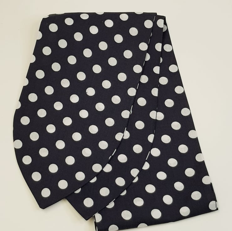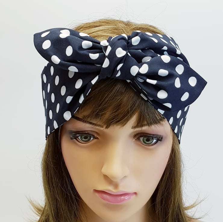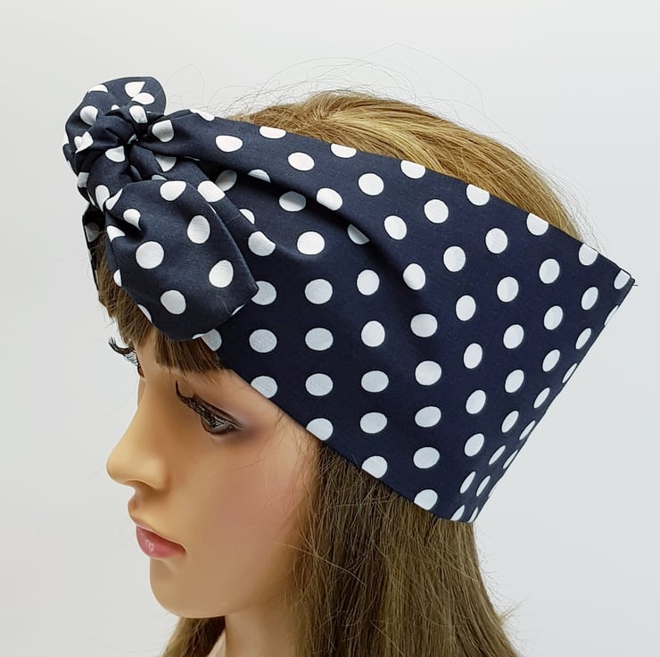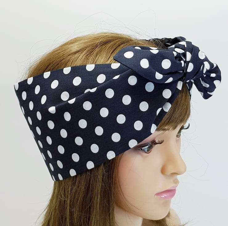 This wide polka dot headband is made from printed polycotton fabric. This handmade head scarf is NOT WIRED, NOT STRETCHY, UNTIED.