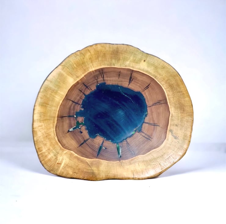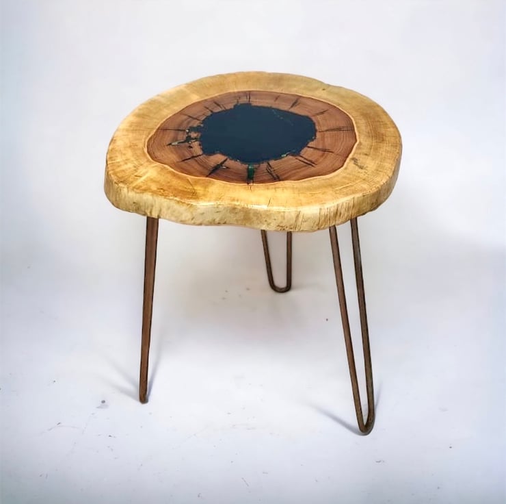 Side table made with wood and transparent epoxy resin.