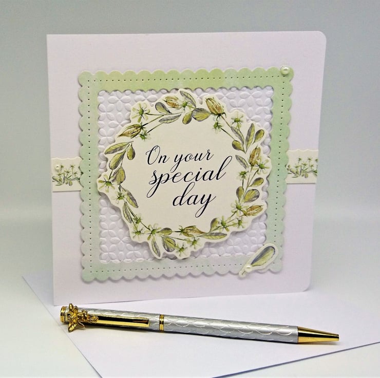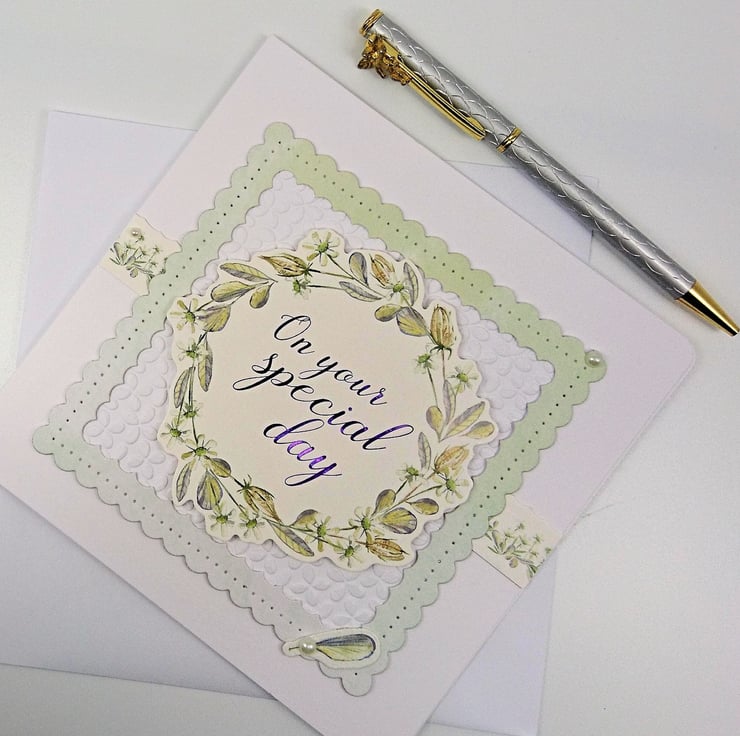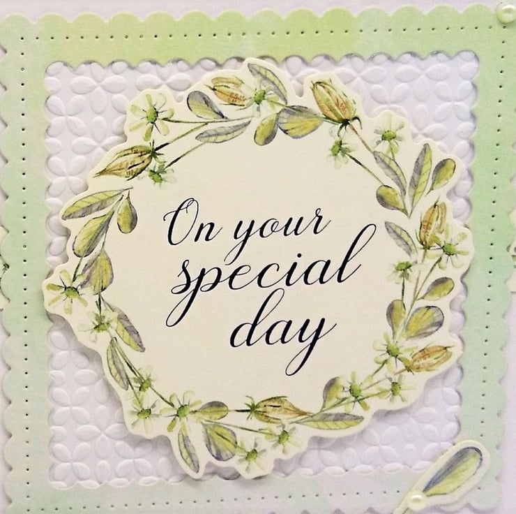 DESCRIPTION: The card is a top quality 250gsm white card with rounded corners, layered with a central pale green and white floral daisy border, a pale green scalloped decorative square frame with internal white embossed floral inlay, further topped with a raised circular garland of daises and grasses surrounding the sentiment “On your special day”. Finishing touch, a single leaf and three delicate white pearls. All my cards are handmade with love, in my wee studio in Argyll, Scotland.