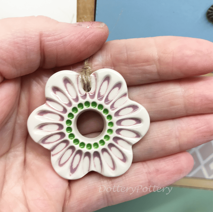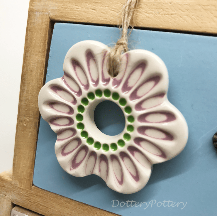 This little flower is made from white earthenware clay and imprinted with a daisy design. It has been fired twice, once to the bisque stage and then a second firing for the clear glaze. It measures 4.5 centimetres wide x 4cm height x 5mm thick.