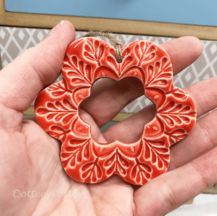 This flower decoration is made from white earthenware clay and imprinted with a floral pattern. It has been fired twice, once to the bisque stage and then a second firing for the bright, colourful glaze. It measures 8 centimetres wide x 6.5cm height x 5mm thick.