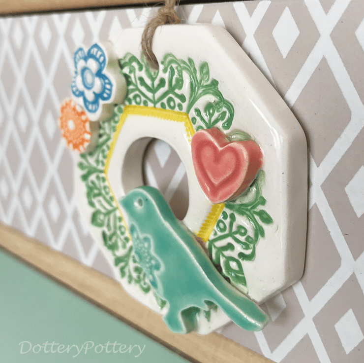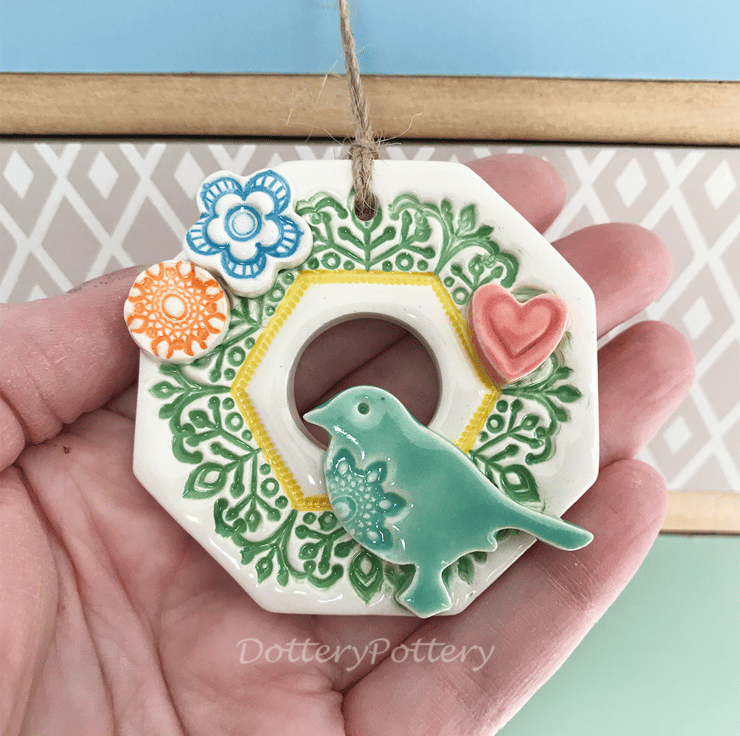 This little ceramic wreath decoration is made from white earthenware clay and finshed with a little pottery bird. It has been fired twice and finished with a glossy glaze for a lovely smooth finish. It measures 6 x 6cm and hangs from rustic brown string