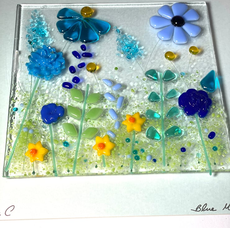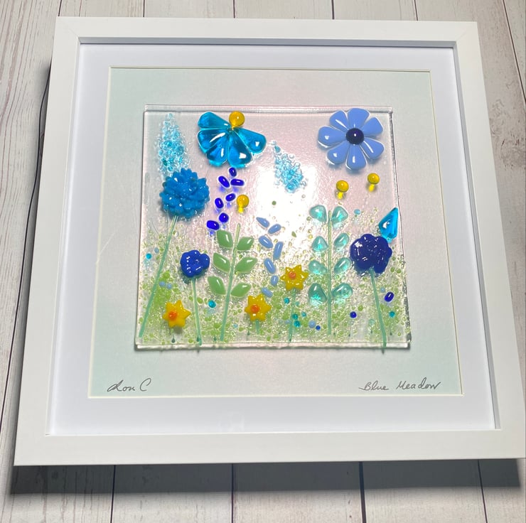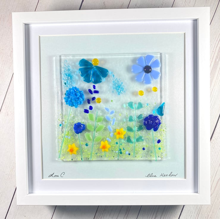 Pretty blue flowers and daffodils in this fused glass art make it eye catching the flowers are 3 dimensional and either cut from sheet glass or made using glass powders. The glass art is mounted on a white square frame which is ready to hang . Dimensions of frame 27cm square .