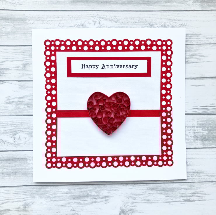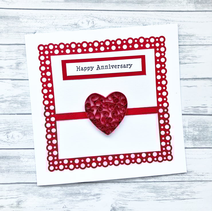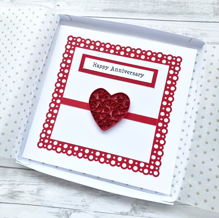 This beautiful anniversary card has a quilled heart in the centre and a matching gift box can also be added for an extra special touch.