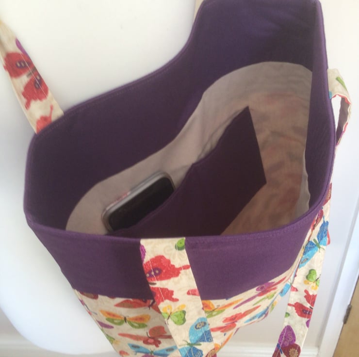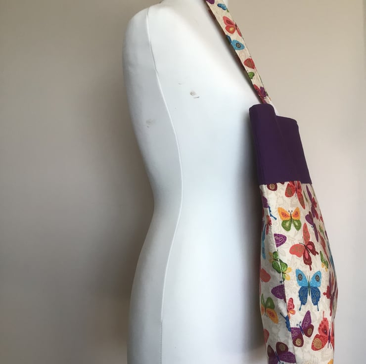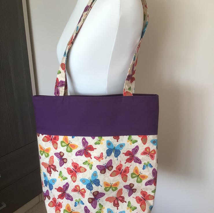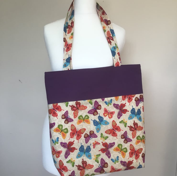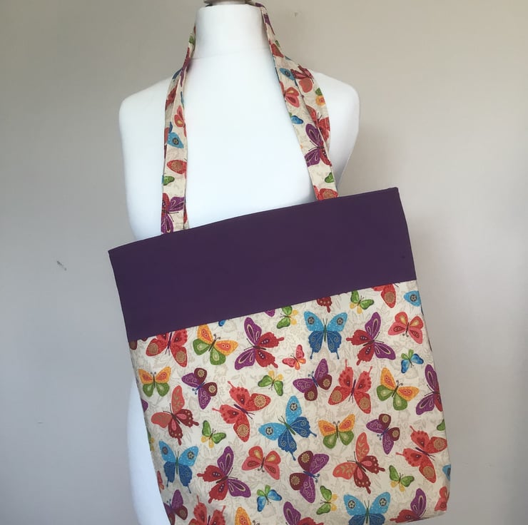 A large tote bag make from 100% cotton featuring colourful butterflies with a complimentary purple band around the top of the bag.