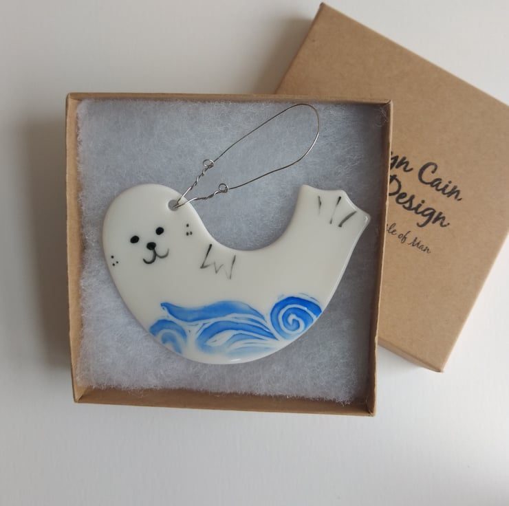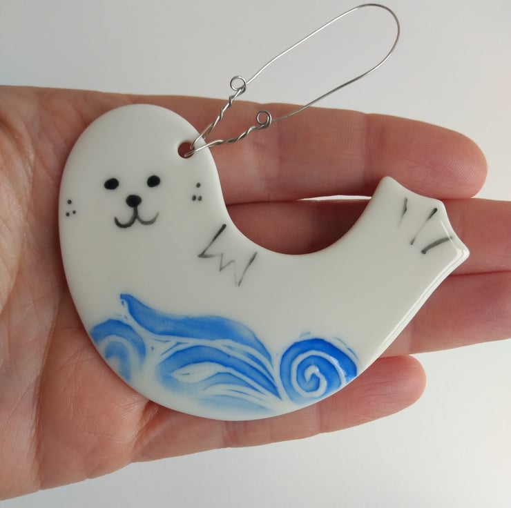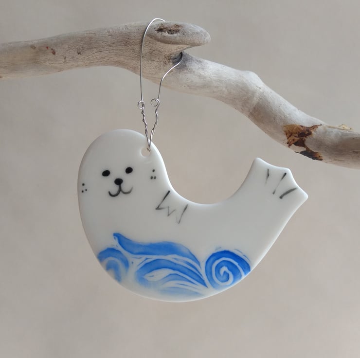Handmade porcelain seal hanging decoration with an impressed blue wave design. Each piece is individually hand painted so the character of each seal is totally unique. This piece is glazed to a glossy shine on its front face with a smooth, matt tactile finish on its reverse where it is signed with the makers mark.