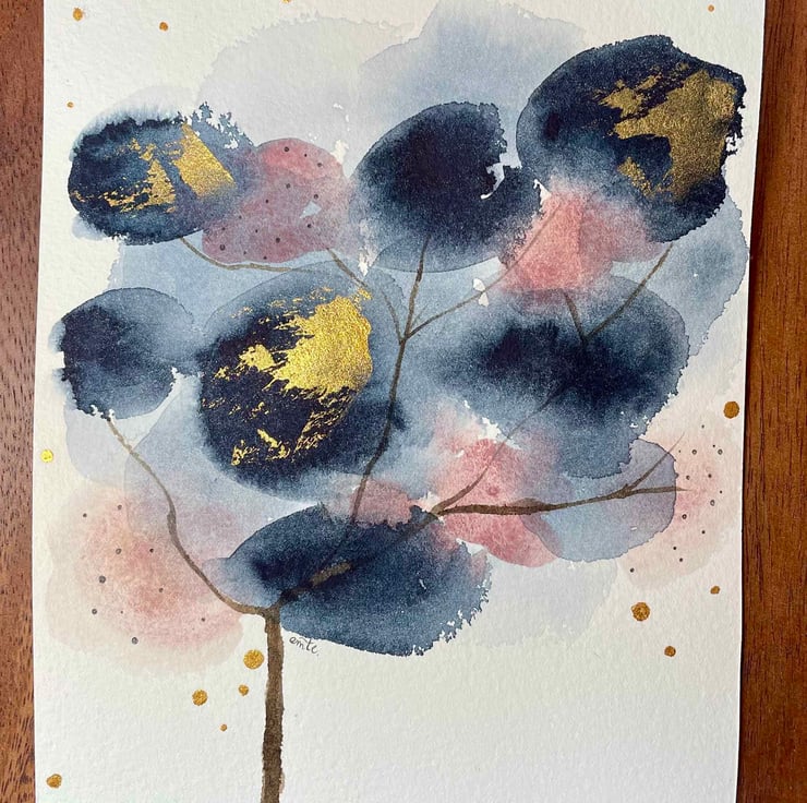 A beautiful painting made with watercolour, with a lot of detail. This peace pictures an abstract tree. Embellished with gold paint.