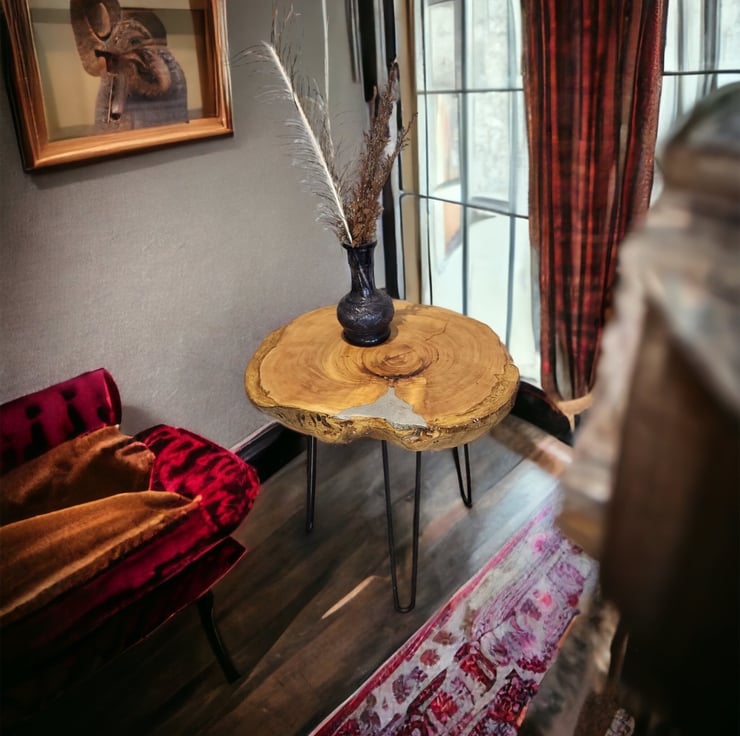 Add a touch of modern elegance to your living room with this live edge emerald resin river coffee & side table. Featuring a stunning combination of wood and resin design, this side table is not only beautiful but also functional. Whether you're looking for a unique focal point or a functional surface for your coffee cups and books, this coffee table is the perfect choice.