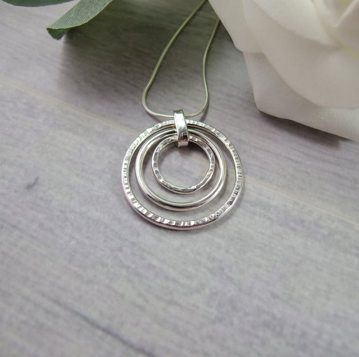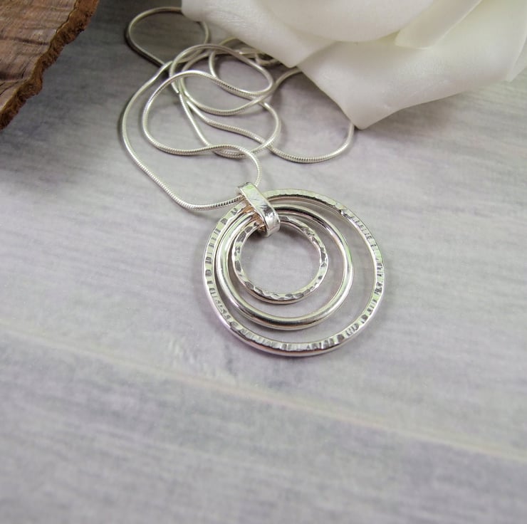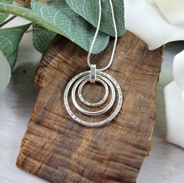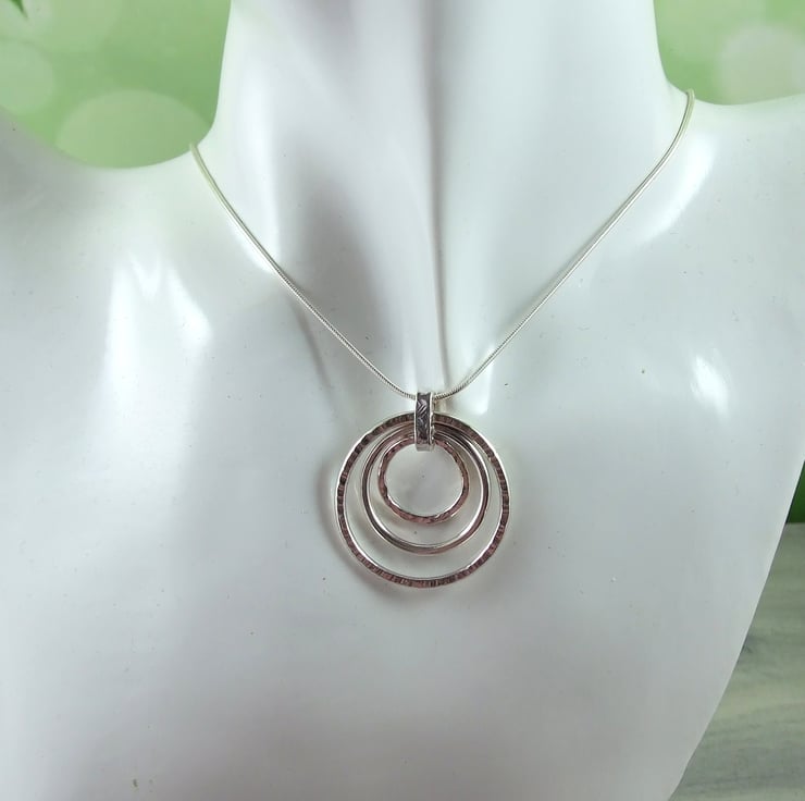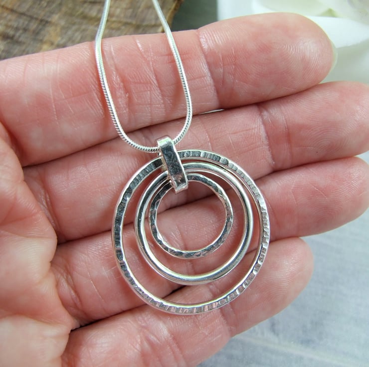 I have made the circles using sterling silver wire, formed by hand and soldered, two have been given different textures with a hammer and the middle one is plain. Fitted to an 18 inch .925 Sterling Silver Chain.