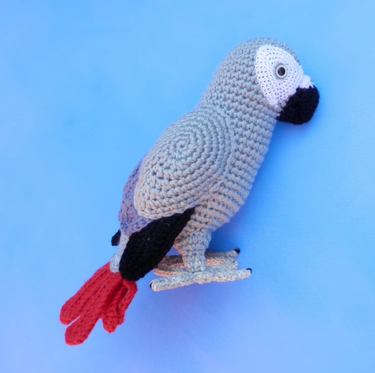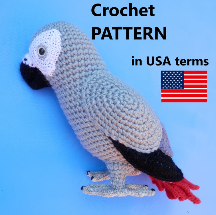 African Grey Parrot crochet PATTERN in USA crochet terms. This item is a DIGITAL DOWNLOAD. This pattern will make a parrot which measures about 10.5 inches from the top of it's head to the tip of it's tail. This parrot is designed to balance on the edge of something such as a table with the tail hanging down. The pattern is written in the English language. Equivalent crochet terms chart in USA, UK, & Spanish is included. Your pattern will be forwarded to you by email.