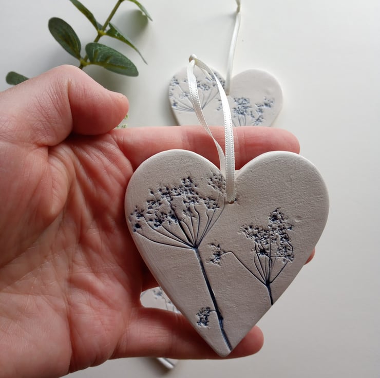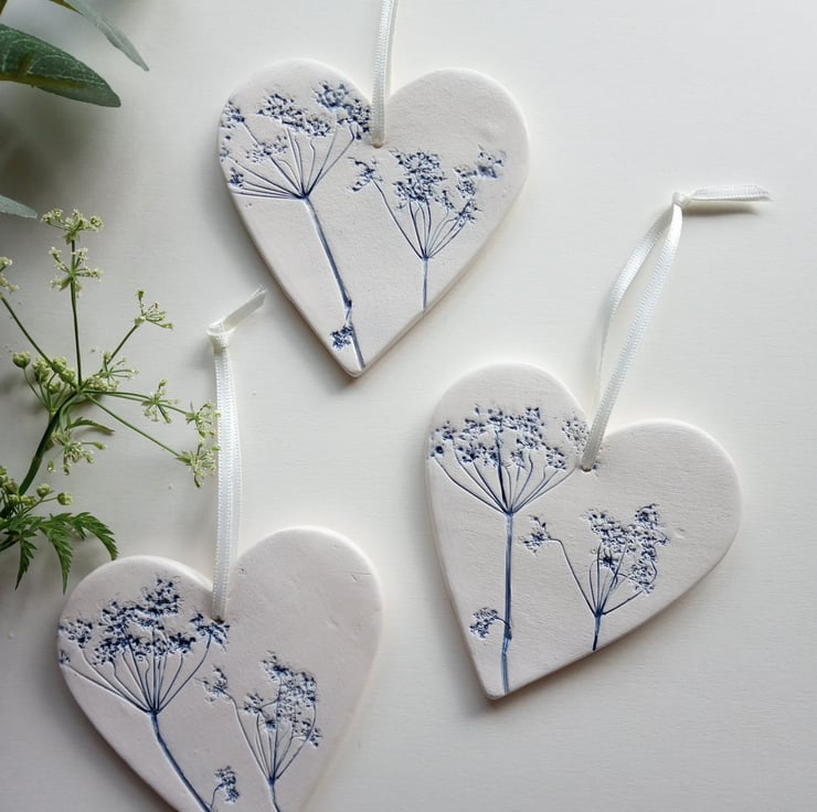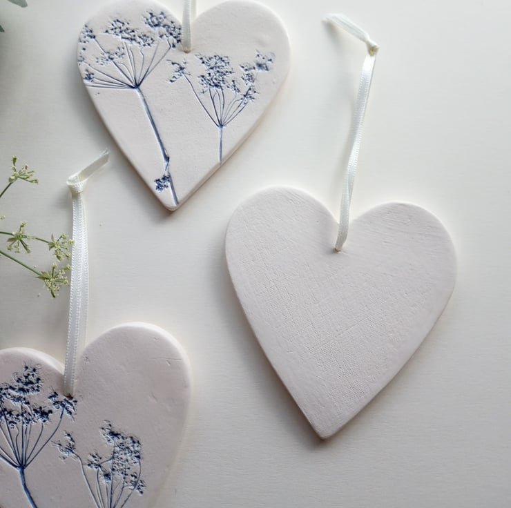 This is a range of beautiful ceramic hearts, each one unique. I've made them with actual plants imprinted into the clay, then dried, fired at 1000 degrees, then I glaze each individual heart and fire it again. The techniques and brush strokes I use show off the delicate detail of the plants. These are a lovely set of 3 which compliment each other. The hearts are approximately 7.5 x 8cm in size. I love the raw earth like quality to the white clay on contrast to the colours of the plants.