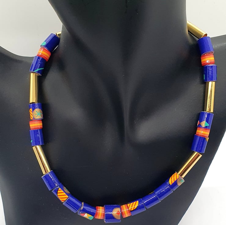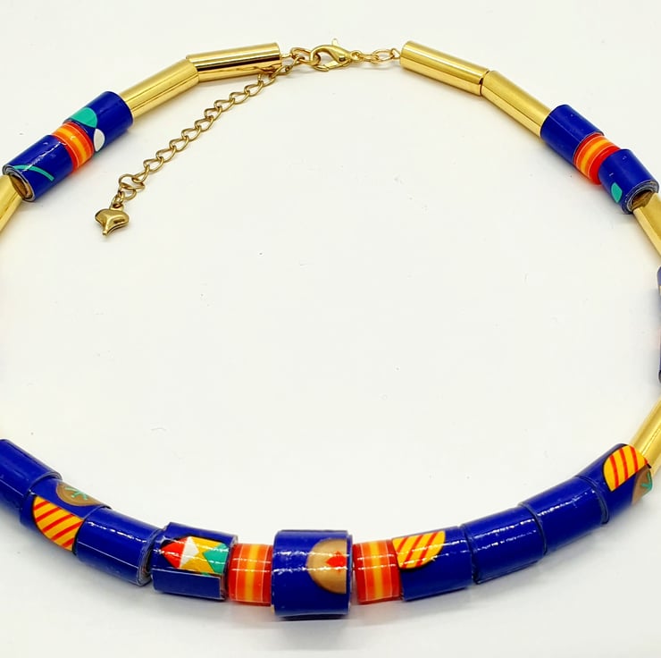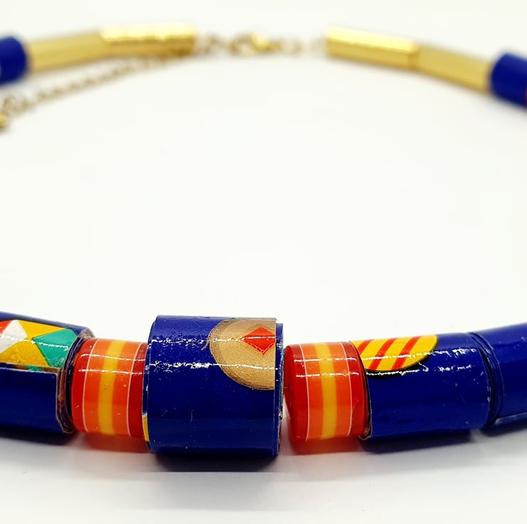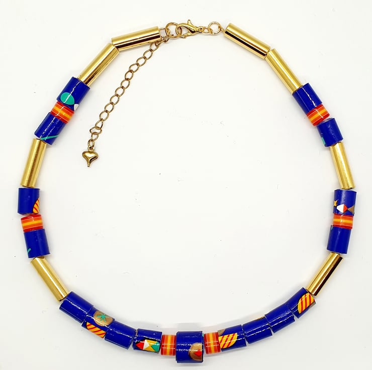 A one-of-a-kind handmade necklace, made with recycled wrapping paper which was cut into strips, handrolled, varnished then complemented with vibrant, contrasting pre-loved resin beads, interspersed with golden tubular separator beads.