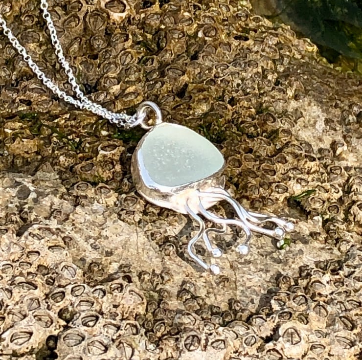 This beautiful piece of frosty white sea glass was found along the UK's South West coastline and has been set in a fine silver bezel (.999) and using recycled (ecosilver) sterling silver wire (.925) to create a beautifully unique Jelly fish pendant. The back of the pendant has been left open so that the gorgeous colour of the sea glass can shine through. This piece has not been hallmarked.
