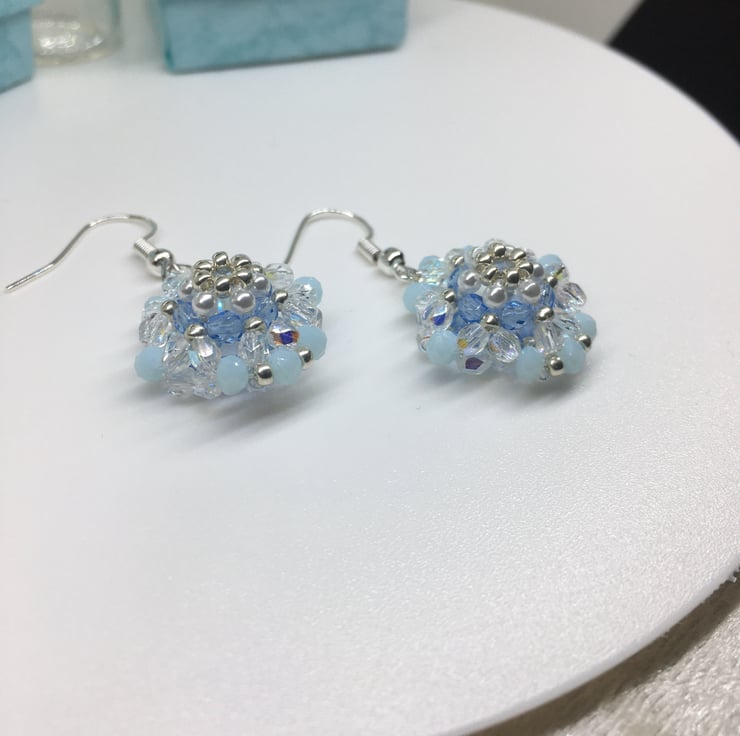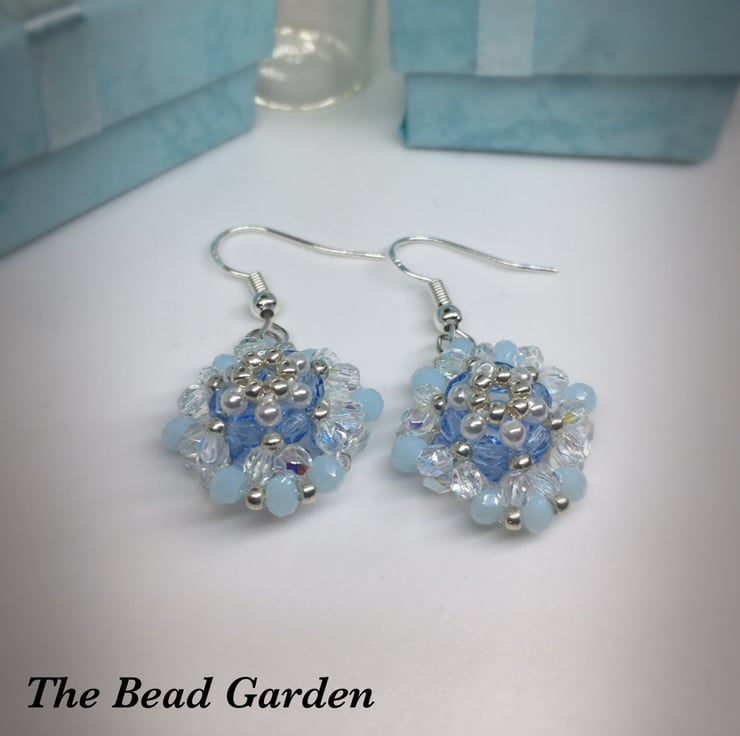 A pretty pair of earrings made by hand weaving with Czech glass beads , pearl beads and Japanese seed beads.