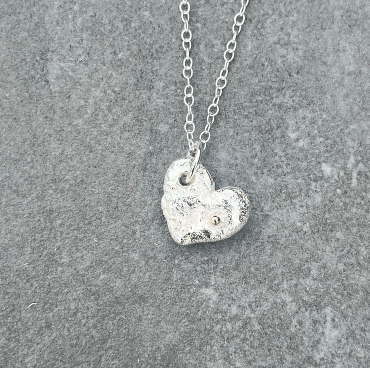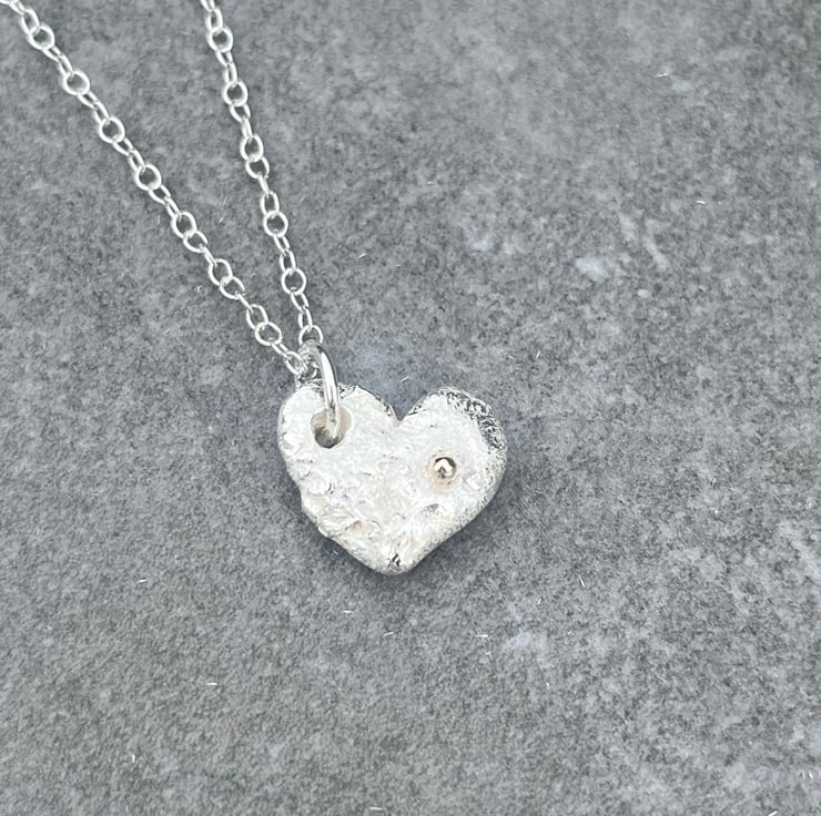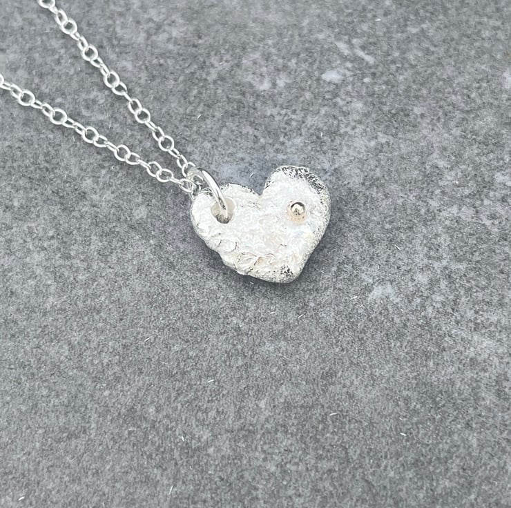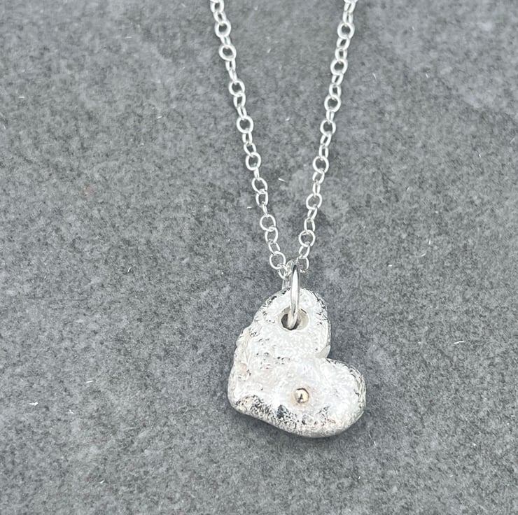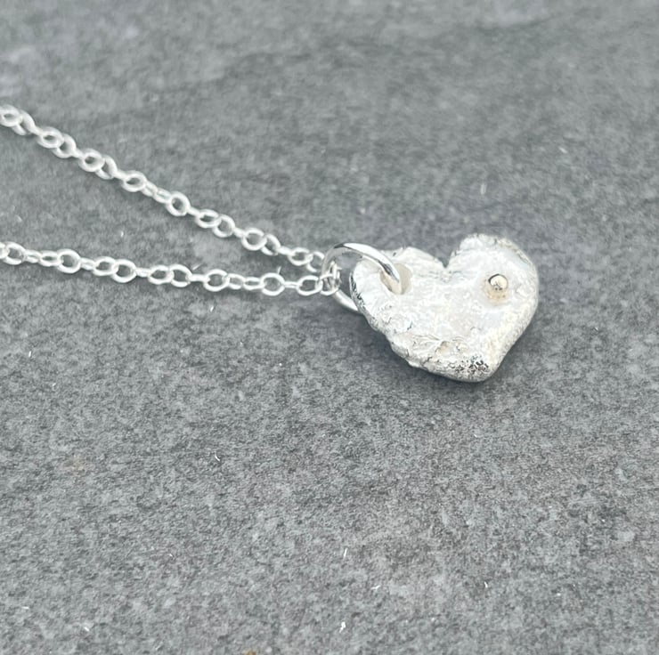 This Sterling Silver and 9ct gold detail Heart Necklace has a rough, earthy feel to it. The silver has a satin finish which contrasts beautifully with the shiny 9ct gold detail. The pendant hangs on an angle and measures approximately 1.3 cm in width. It hangs on an 18” Sterling Silver chain which is 2.5mm wide.