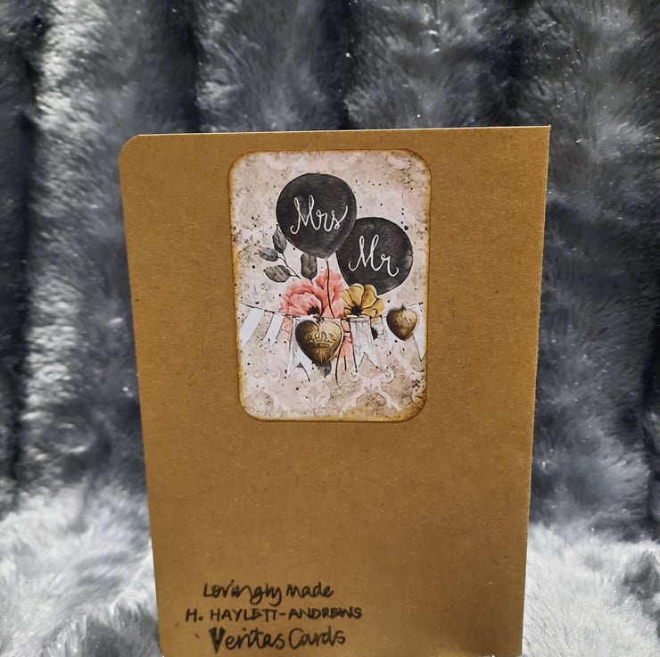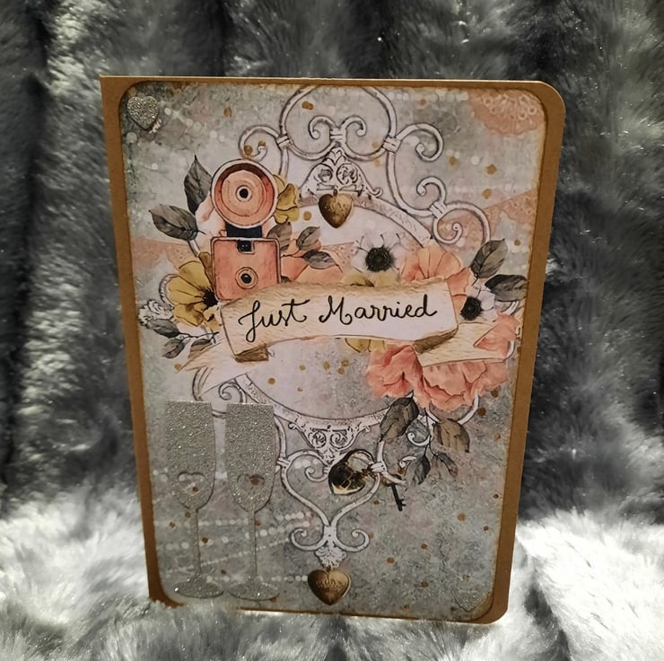 Kraft portrait A6 card with a pretty wedding inspired card stock 'just married' with two silver die-cut champagne glasses with two wee hearts at top left and bottom right hand corners of card.