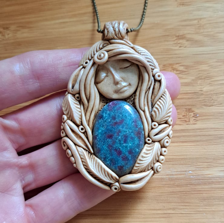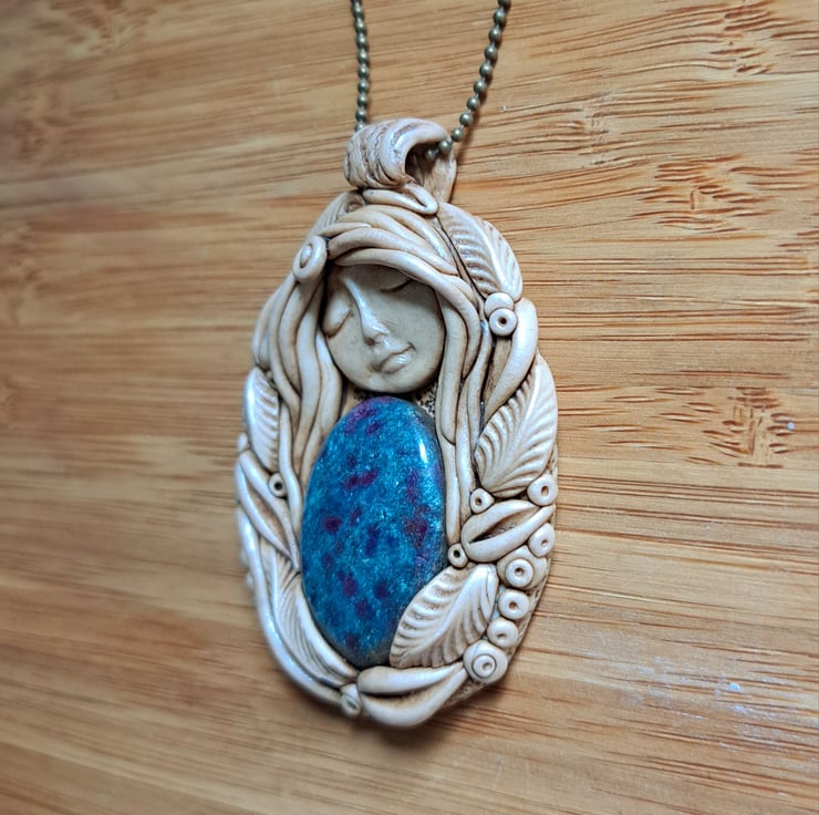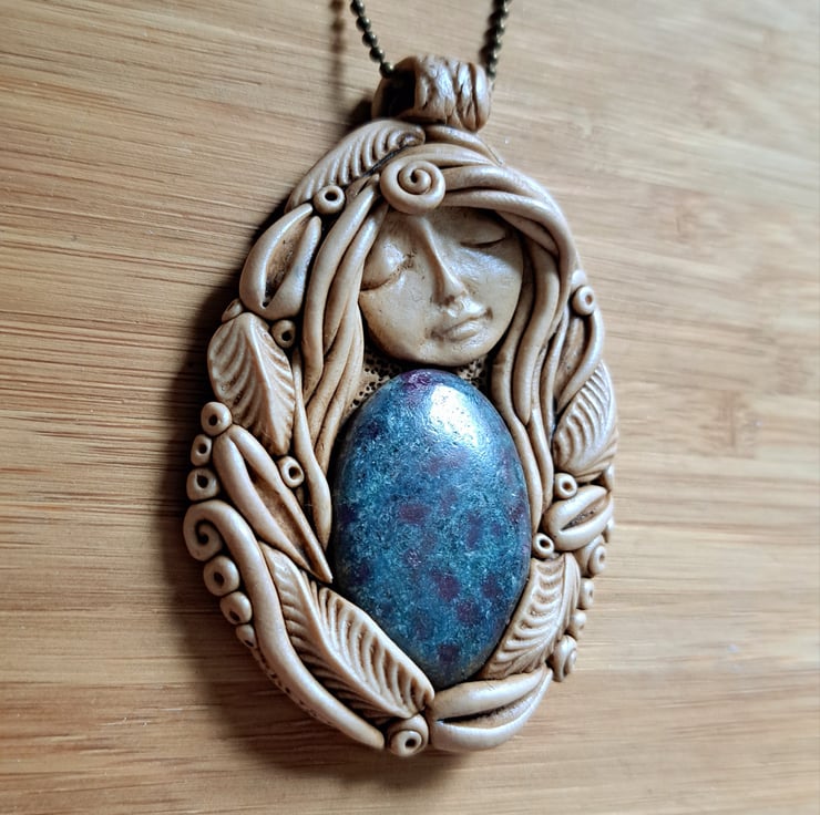 This pendant has been lovingly handcrafted with ruby kyanite and polymer clay. It is finished with a bronze ball chain that slips over the head comfortably. This can be shortened if you wish by cutting the chain to your desired length and clipping it back into the connector. .
