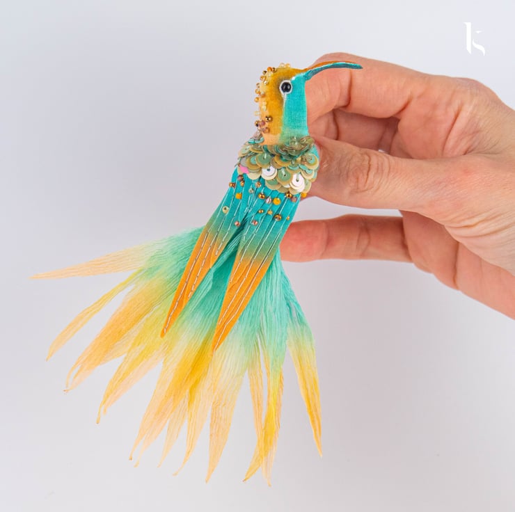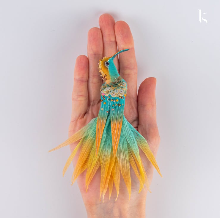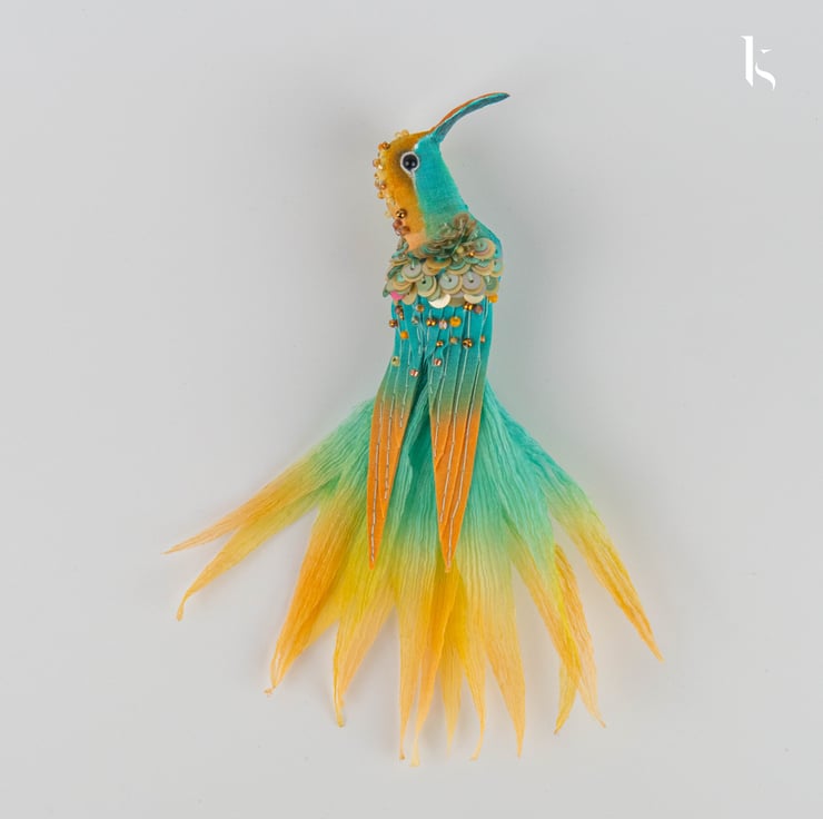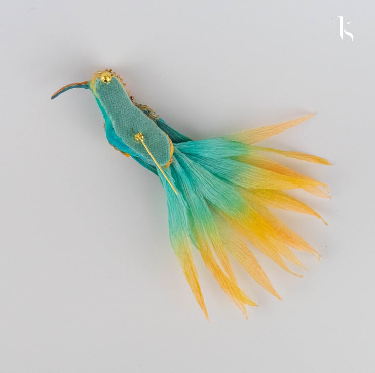 This small hummingbird brooch from the “Bird Park” collection presents a distinctive colourful design. Adorned with complex detailing, the embellishment has an upbeat (even holiday) feel. It only seems fragile. The beak and wings are rigid and safe for clothes.