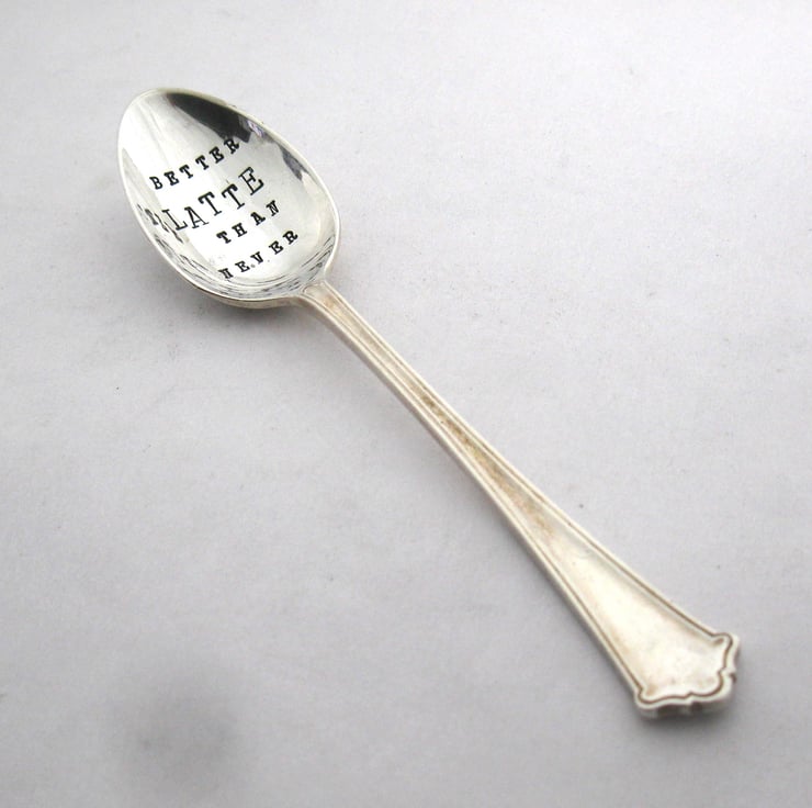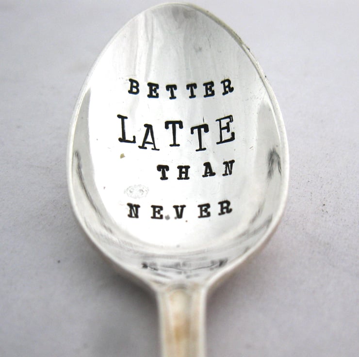 'Better Latte Than Never' - a truly terrible coffee pun that I just couldn't resist putting on a spoon! This handstamped vintage coffeespoon has an elegantly shaped handle with a 'thread' edging and is the perfect way to brighten a coffee-lover's day. Especially if they are rubbish at timekeeping...