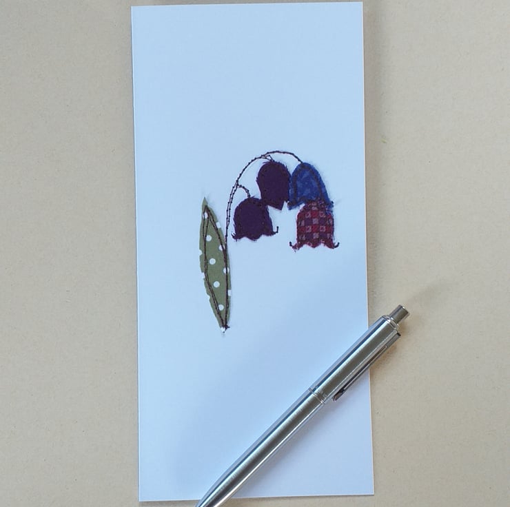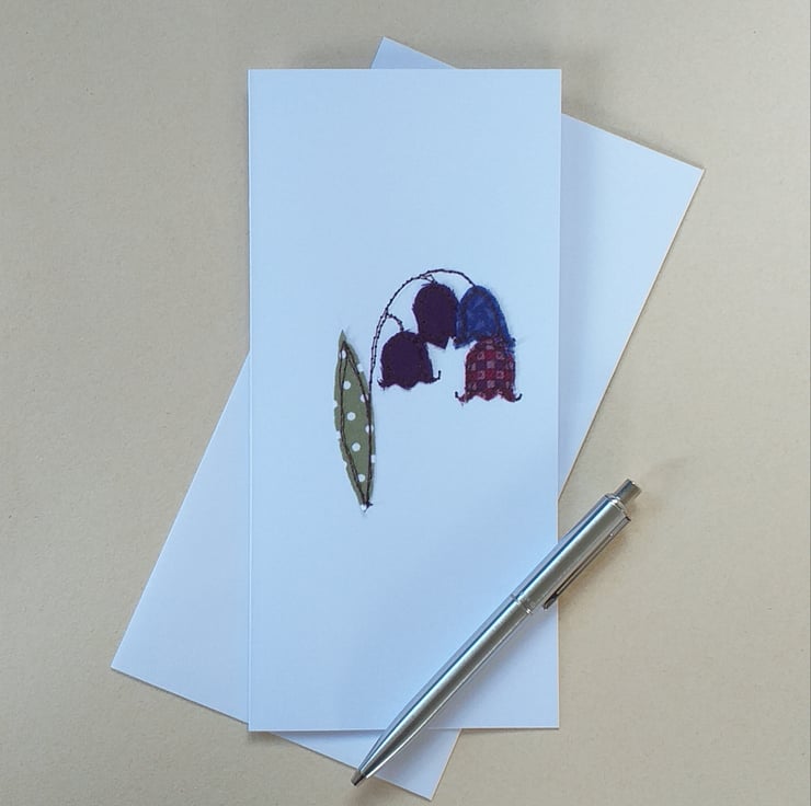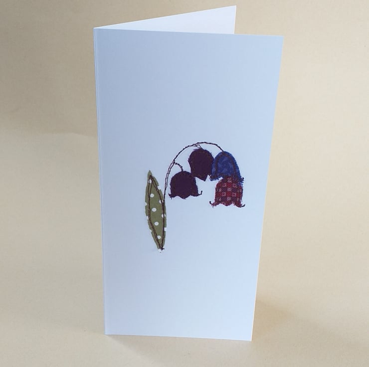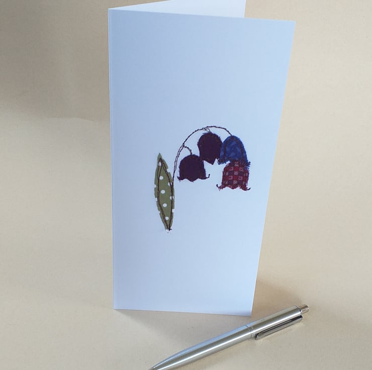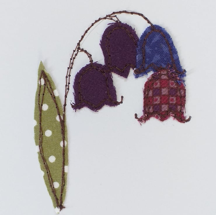 A beautiful card depicting bluebells. Made by sewing snippets of fabric straight onto card using free motion embroidery.