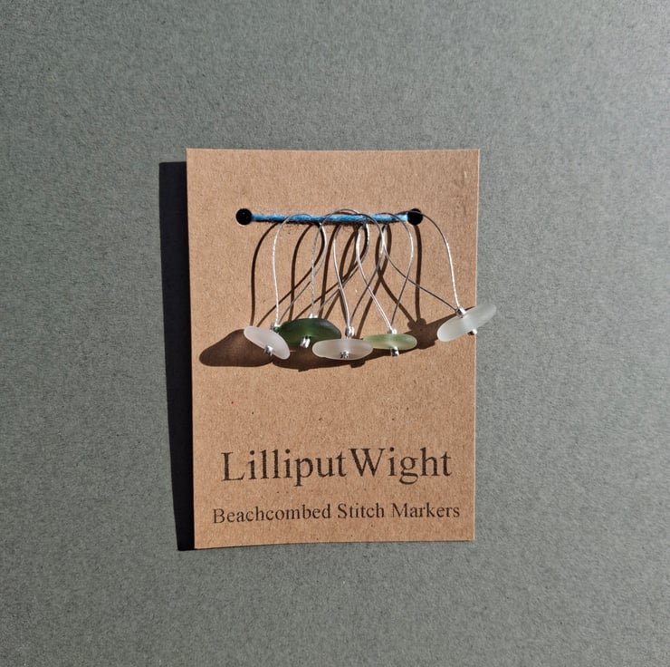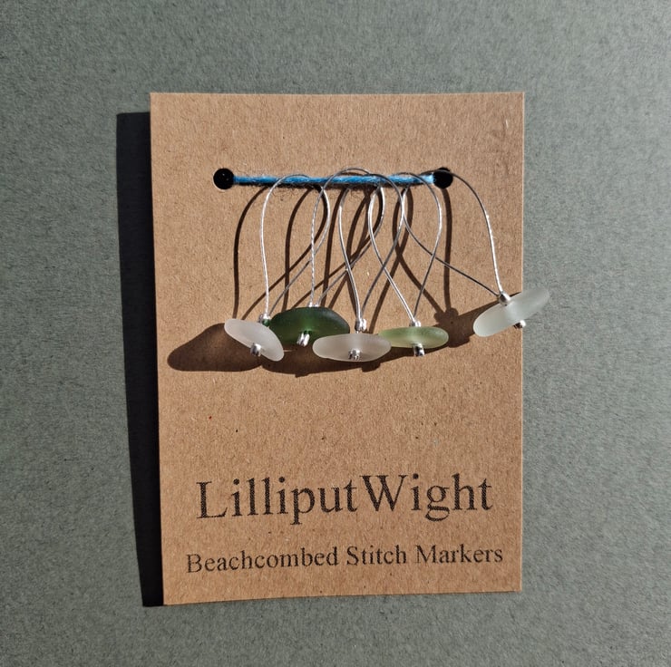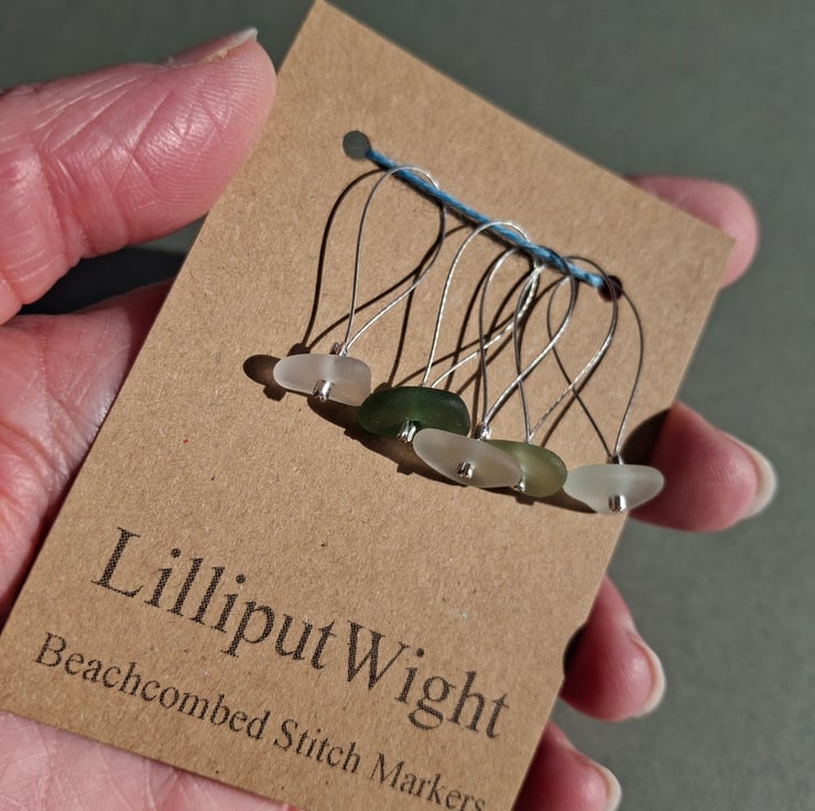 A set of five sea glass stitch markers in shades of green and white. The sea glass is all genuine and has been collected from beaches close to my home on the Isle of Wight.