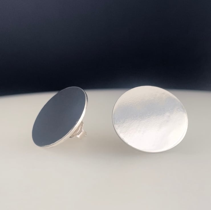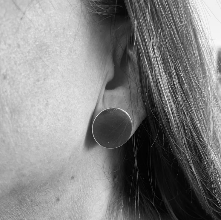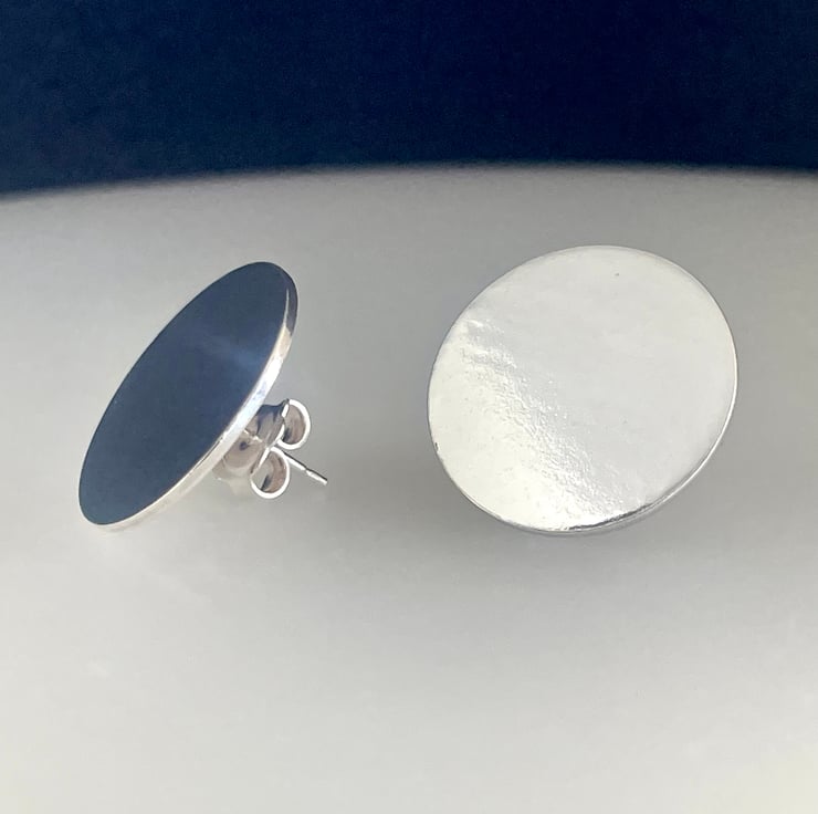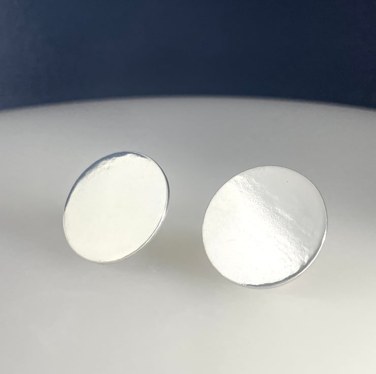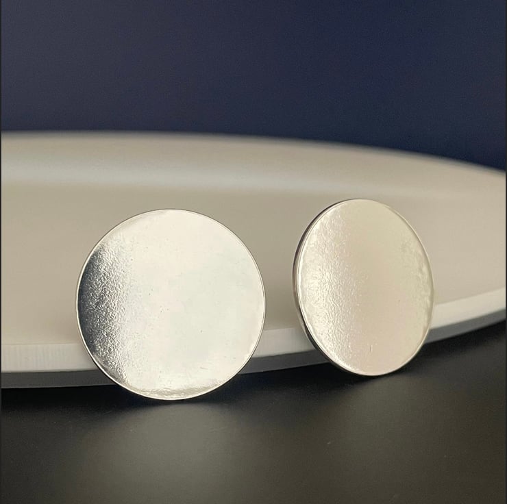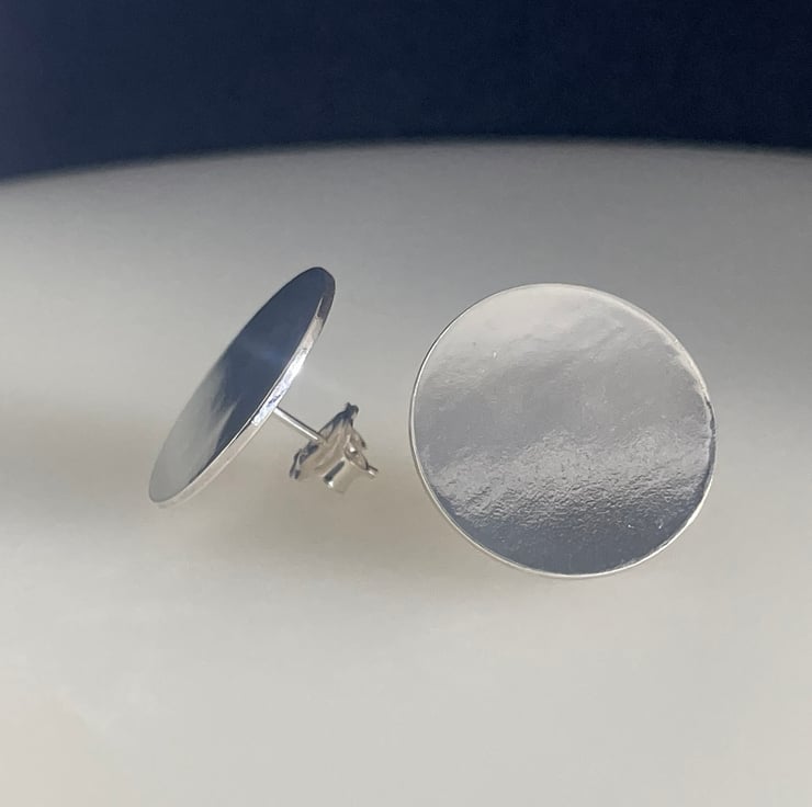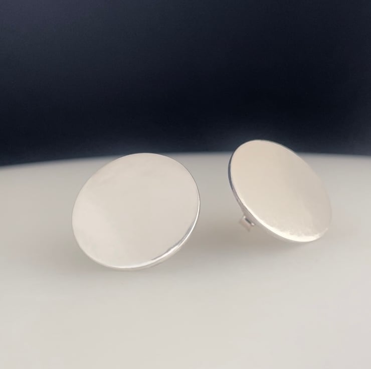A lovely large pair of round ear stud earrings cut out by hand from solid 1mm thick 925 sterling silver sheet metal and then worked to create their unique attractive plain- smooth surface. They have 11mm long pin fittings (in the centre) and are secured with stamped sterling silver scrolls/butterflys. Finished off with a high polished shine.