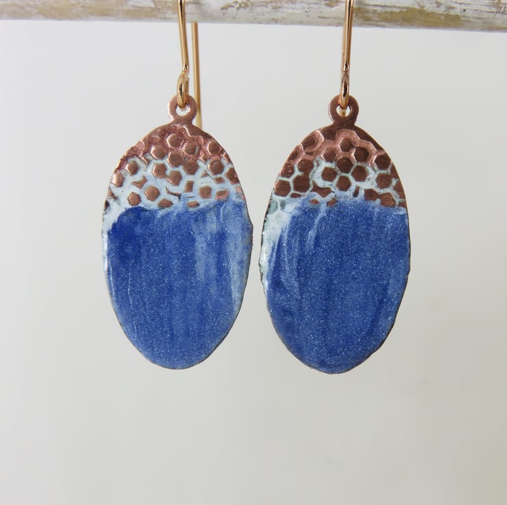 PLEASE NOTE : These earrings are a popular design and I make batches of them. The enamelling process can never be repeated identically as it is like running water and goes where it wants. I make them in the same way but some may be a slightly darker blue.