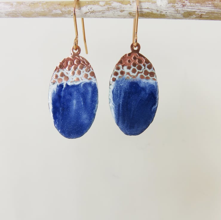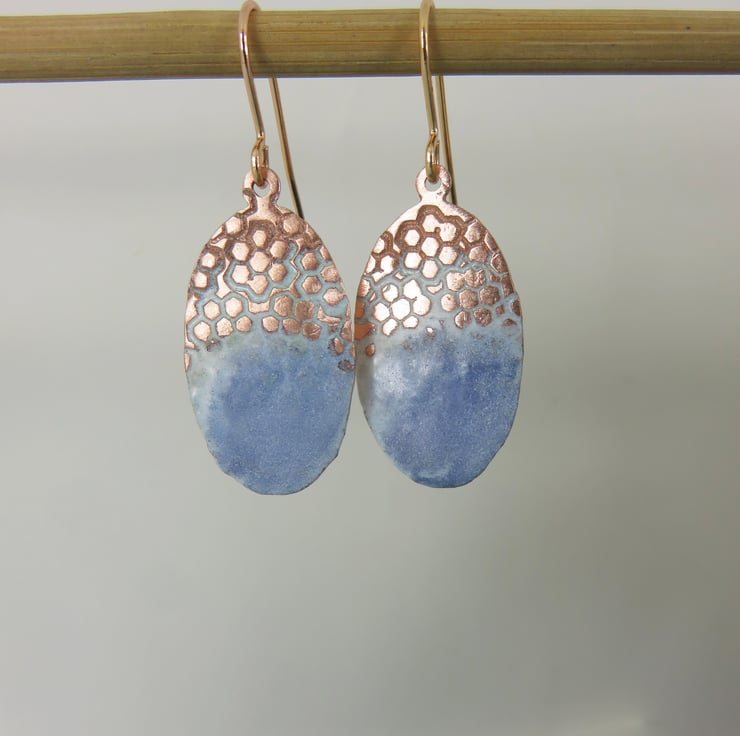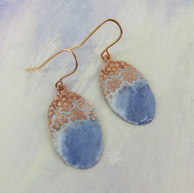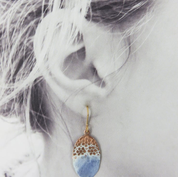 29mm long x 15mm wide oval copper dangle earrings decorated with a lacy texture and washed with a white and blue enamel. They hang on rose gold plated earring hooks for pierced ears. They measure 40mm from the ear to the bottom of the earring. Fired in the kiln at 830 degrees.
