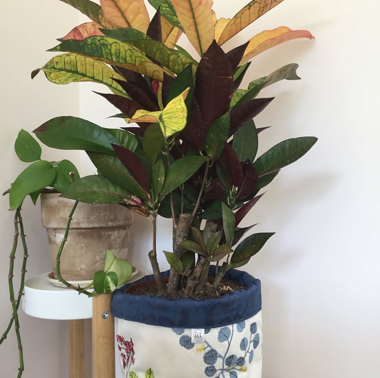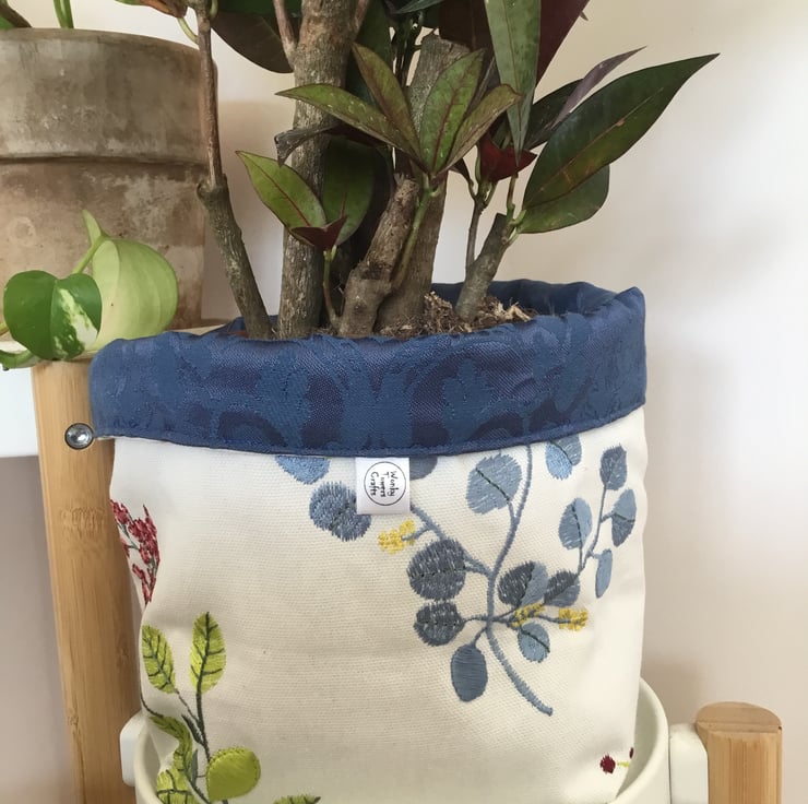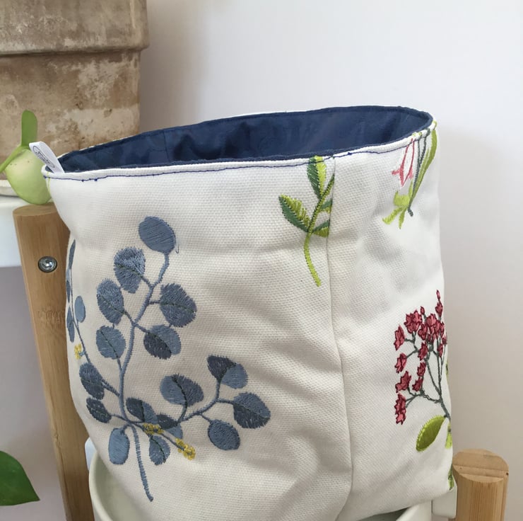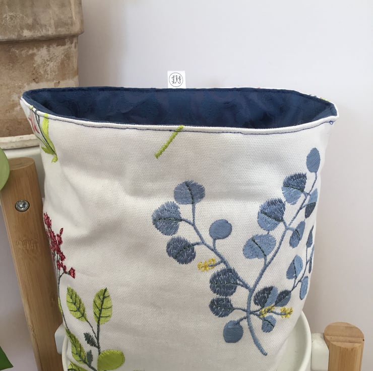 This fabric basket is made from a remnant of Clarke and Clarke’ Brigitte. This beautiful fabric is embroidered with flowers and leaves in blue, pink and green on a cream background. The basket is lined with a rich blue damask which picks out the blue in the embroidery. It is ideal for displaying a favourite house plant, comfortably holding a 16cm saucer and flower pot (the saucer is needed as the basket is not waterproof). If you’re not into house plants the basket would be just as happy in the bathroom, keeping all your lotions and potions safe and tidy, or on a desk, storing crafty bits and pieces.