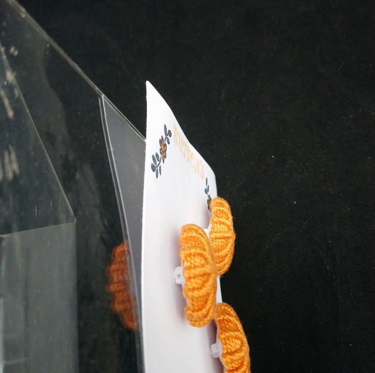 Buttons have been threaded onto a decorative card and inserted into a self sealing plastic bag.