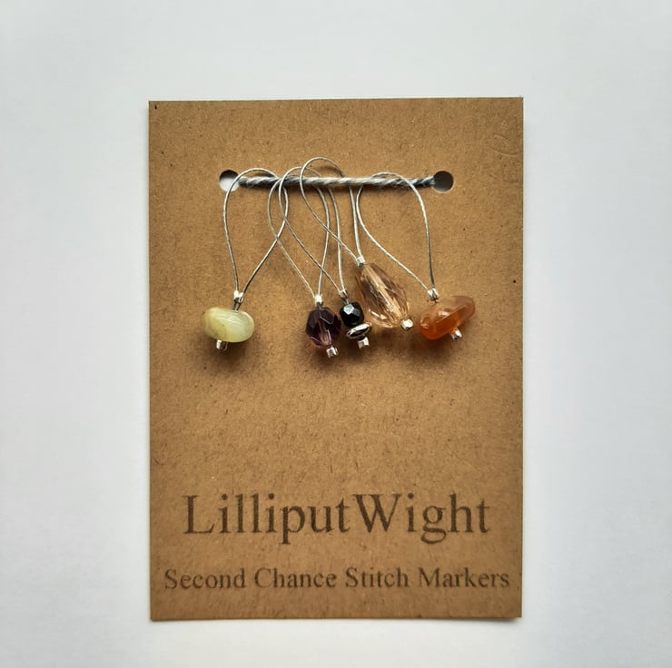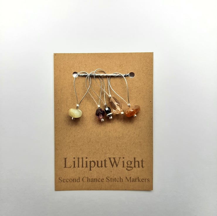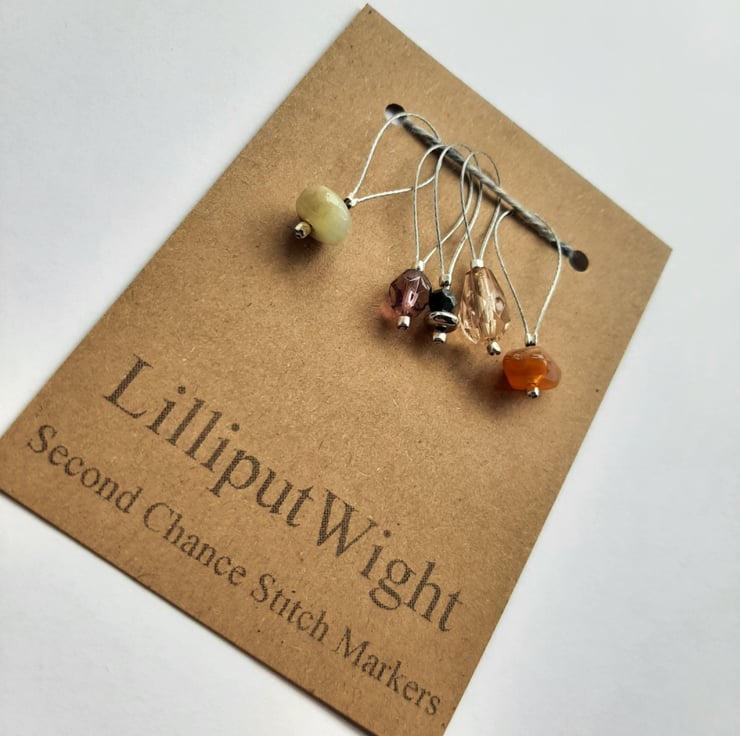 Thin beading wire is used to make the stitch marker loops meaning that they slide easily along your needles with crimps holding the beads in place. They will sit happily on a needle up to 7mm.