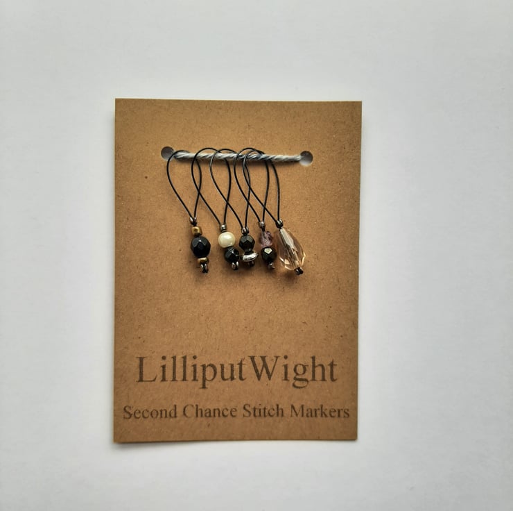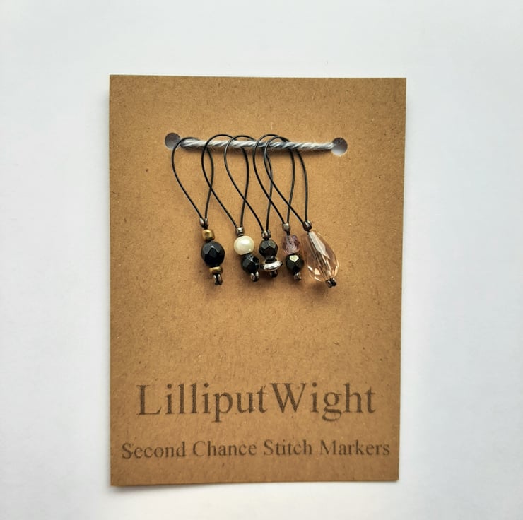 Inspired by a broken earring this range of stitch markers is made from the broken and unloved jewellery found in charity shops. They are broken apart, cleaned and dried before being turned into stitch markers and given a second chance of life.