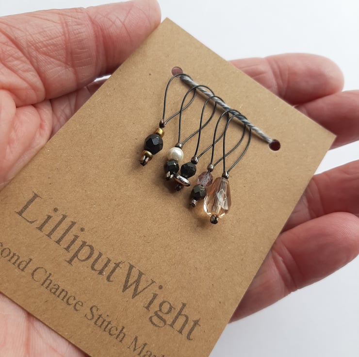 Thin beading wire is used to make the stitch marker loops meaning that they slide easily along your needles with crimps holding the beads in place. They will sit happily on a needle up to 7mm.