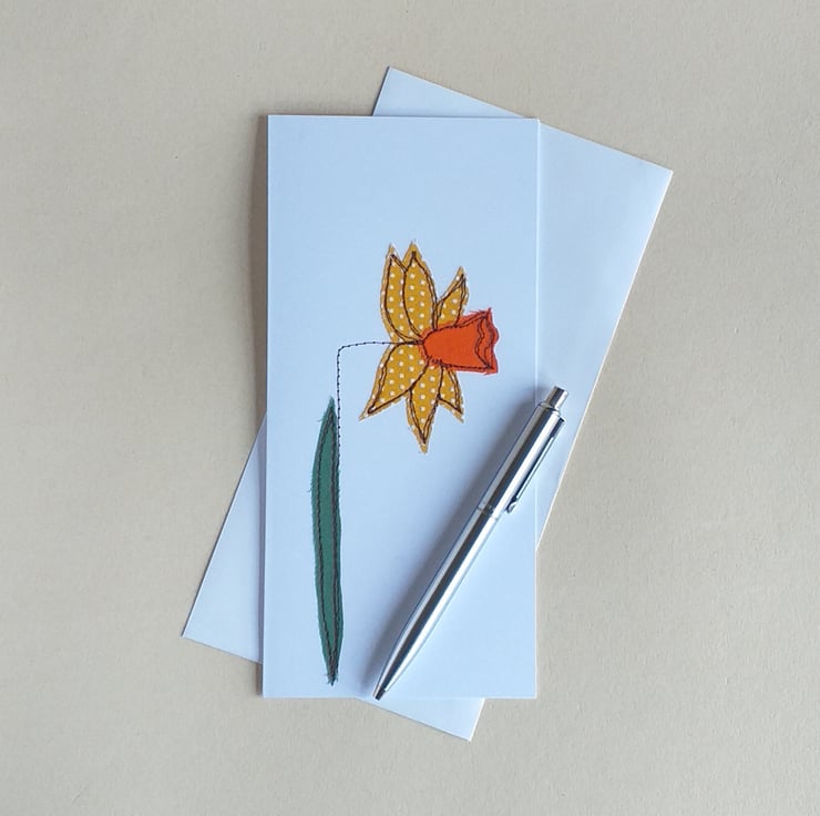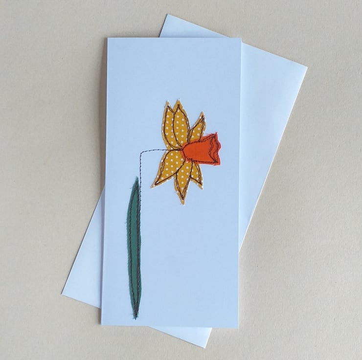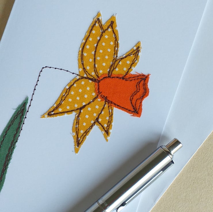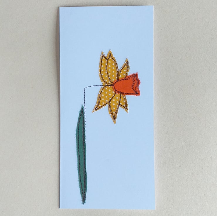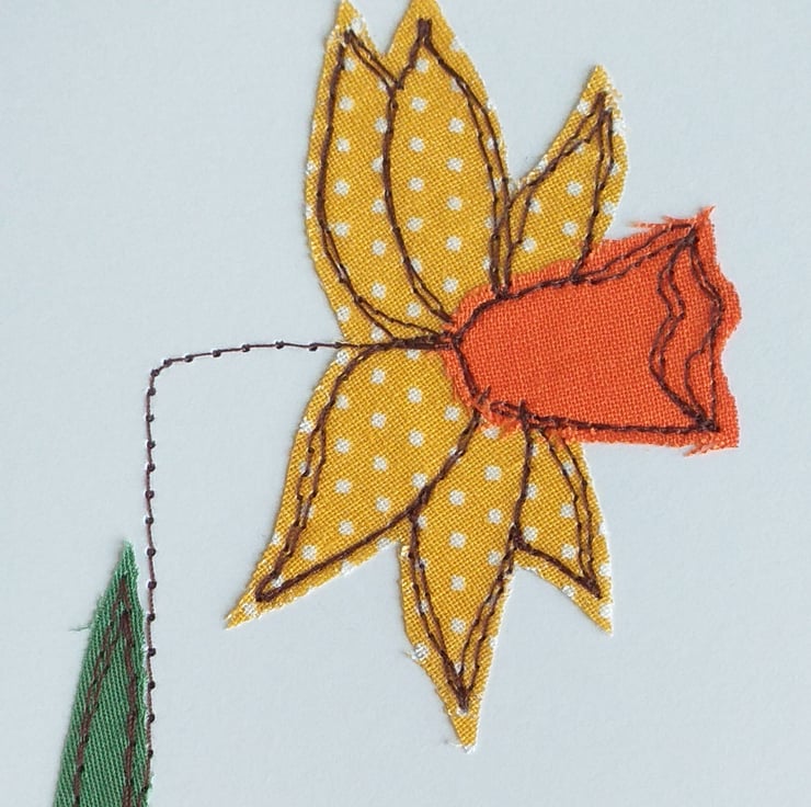 A simple card depicting a single daffodil. Made by sewing snippets of fabric straight onto card using free motion embroidery.