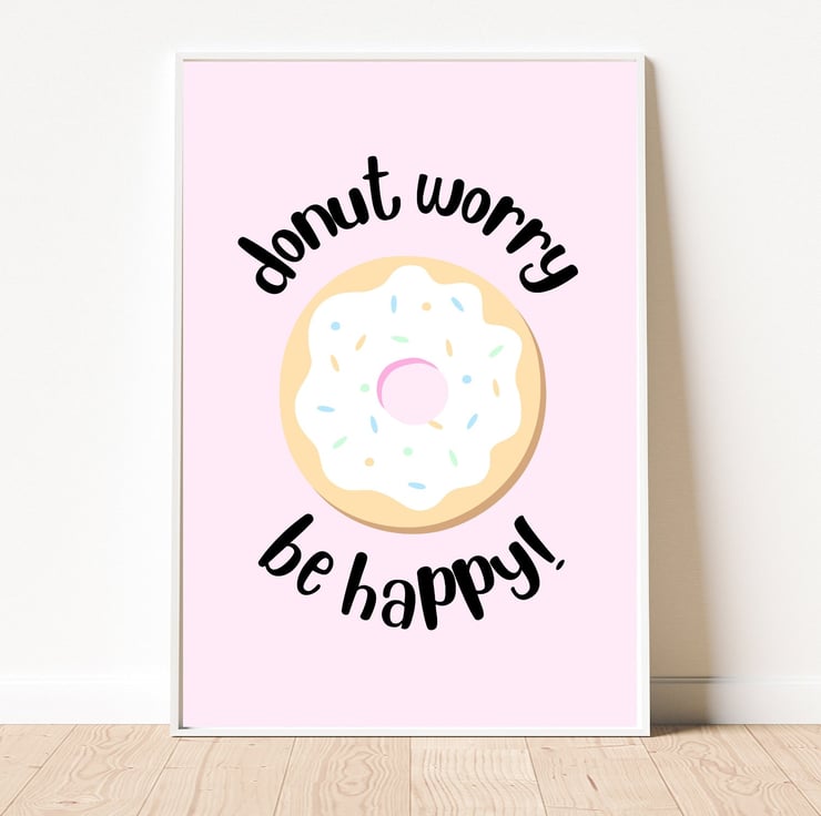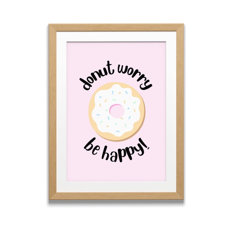This donut worry be happy art print will make a sweet addition to gallery walls or a statement piece on its own.