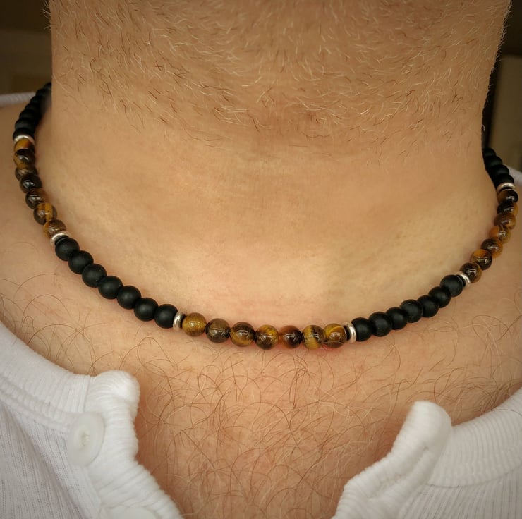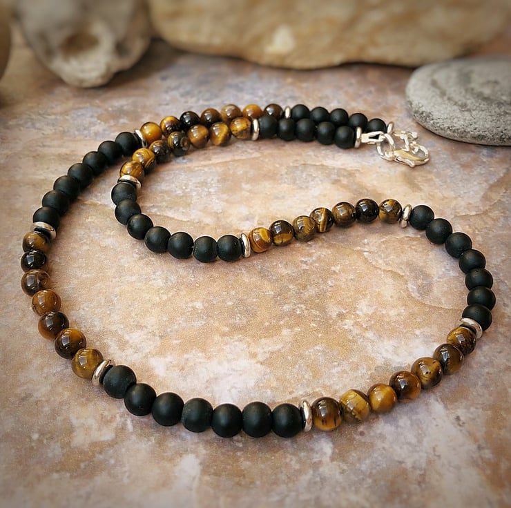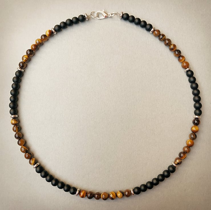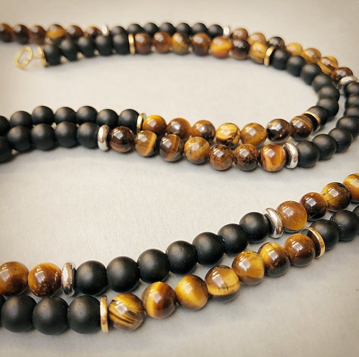 Handcrafted from smooth matt-black Agate gemstone beads and glossy Tiger's Eye, with a choice of colour accents. Choose from either silver-tone or gold-tone spacers with silver-plated or gold-plated findings.