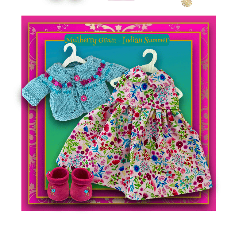 A pretty dress in a pink and gold flower pattern, to fit the Mulberry Green characters. The dress is made from best quality cotton, has a full skirt and a lined bodice.