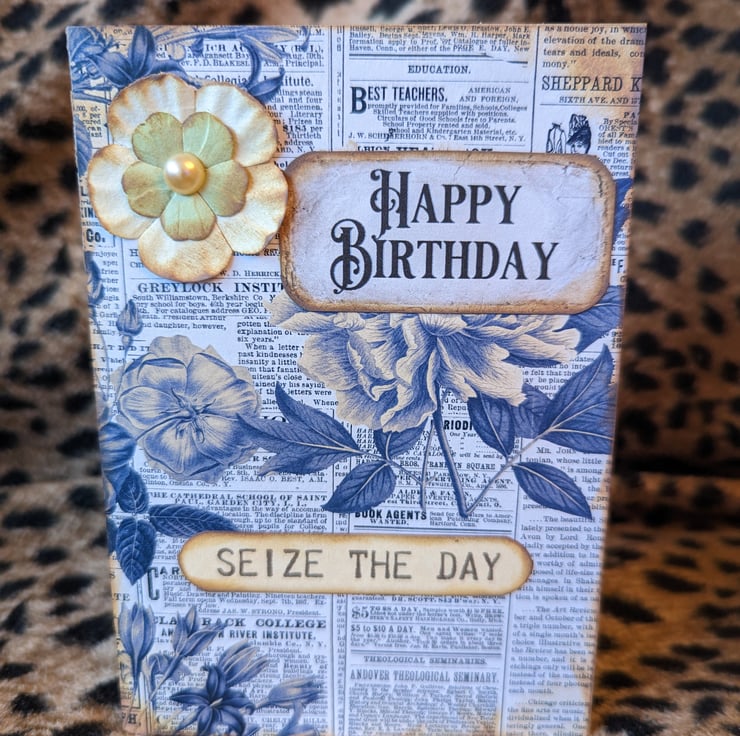 Happy Birthday and Seize the Day focal points with a paper flower at top left hand side, complete with a sticky pearl gem centre