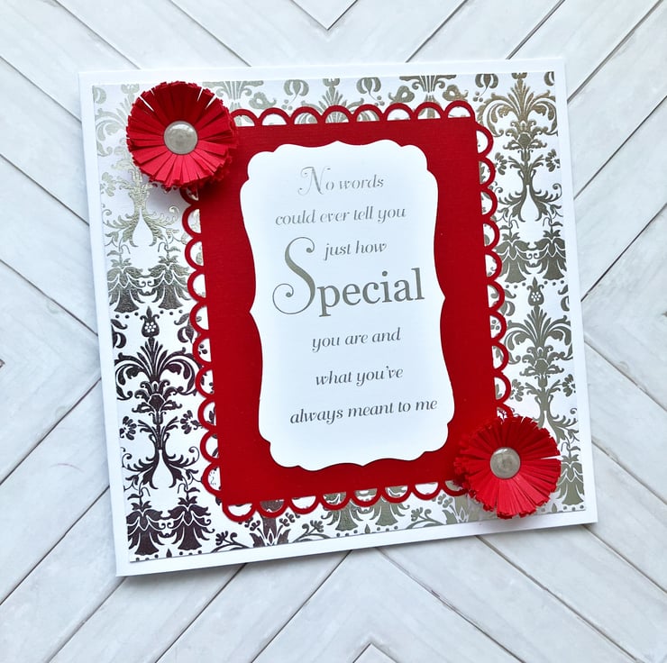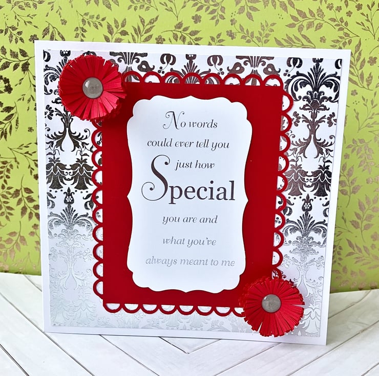 This beautiful luxury card features red quilled flowers and a silver-foiled message which reads