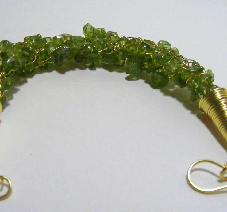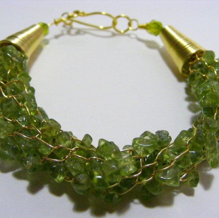 I've handmade this gemstone bracelet with, peridot nuggets and gold plated wire which has been braided together on a kumihimo board. Threaded over the ends of the wire are handmade gold plated cones and 5mm green faceted quartz beads, Clasp is handmade.