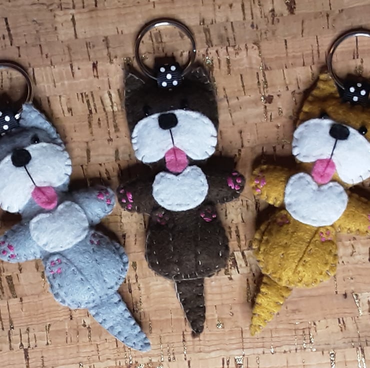It is lightly stuffed with polyester toy stuffing and there is a split ring attached by a ribbon to each key ring.