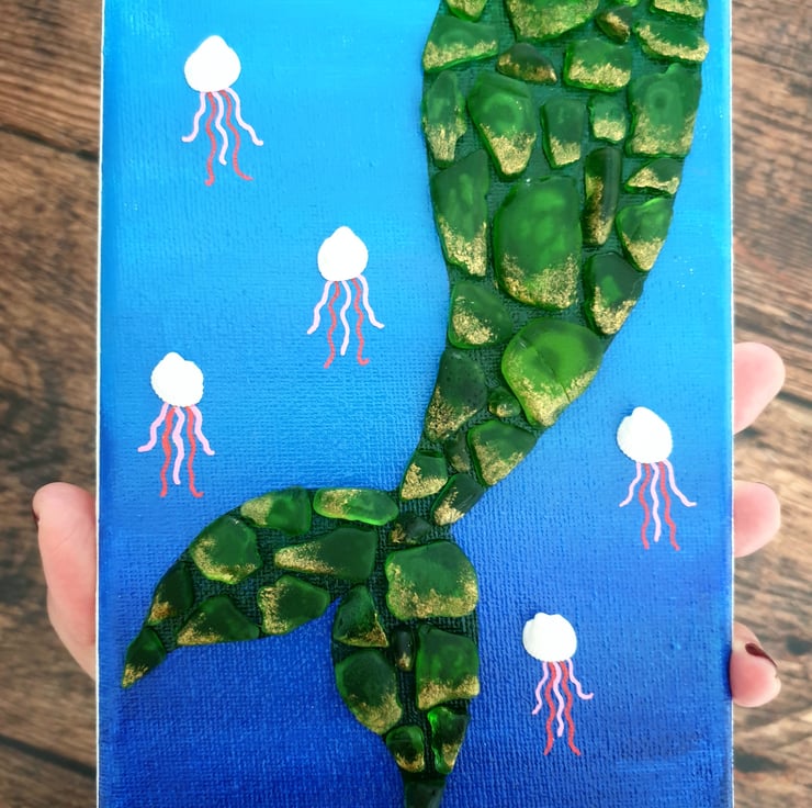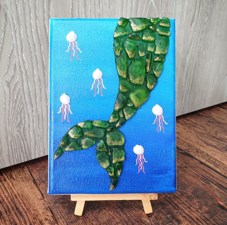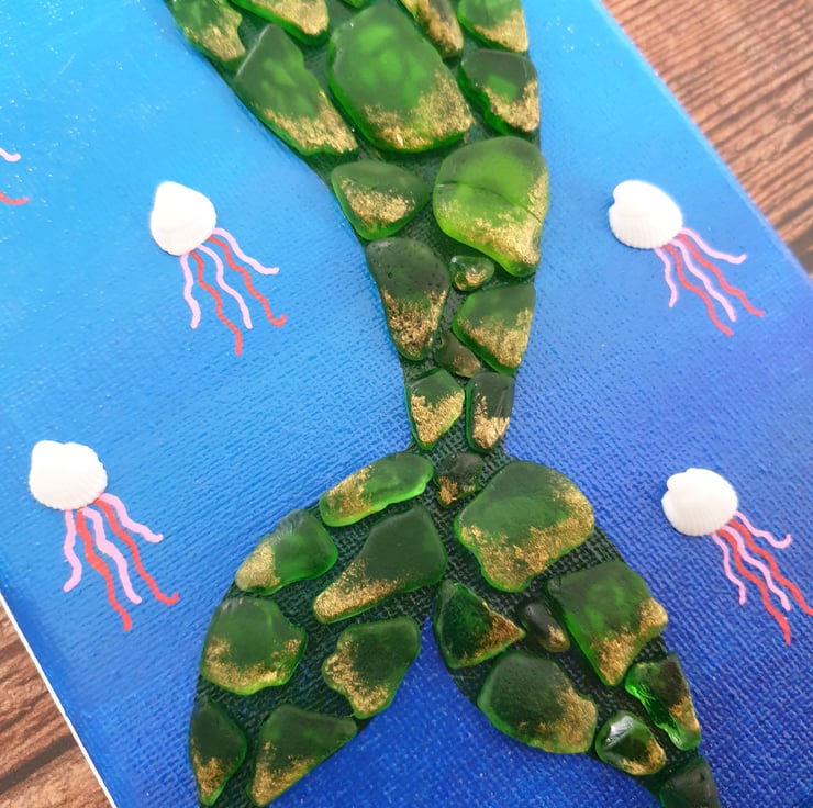 This piece is created with several genuine green sea glass with small white seashells as the jellyfish. The edges of the seaglass has been lightly painted with gold acrylics to give a shimmering effect.