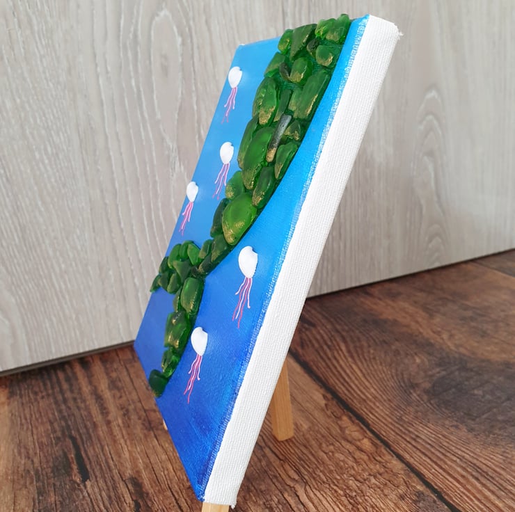 The canvas is painted with acrylics and lightly sealed with varnish. It measures approximately 17.5 cm x 12.5 cm. Stand will be included.