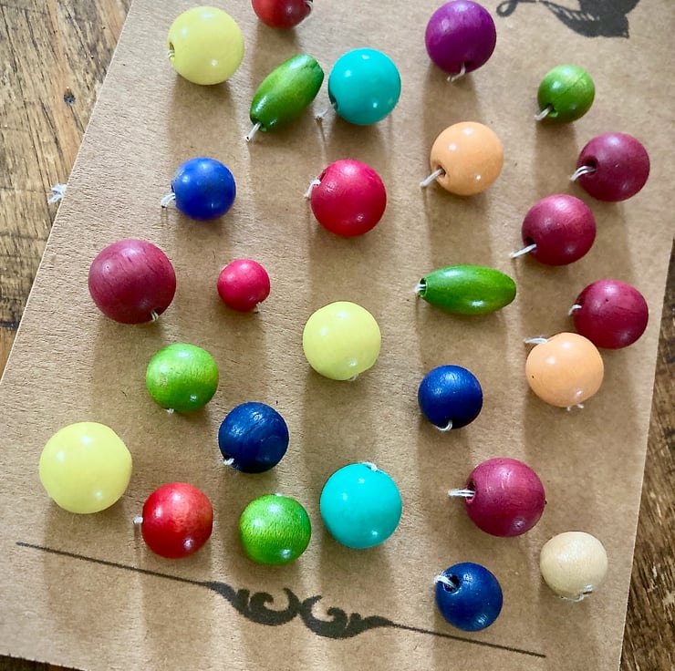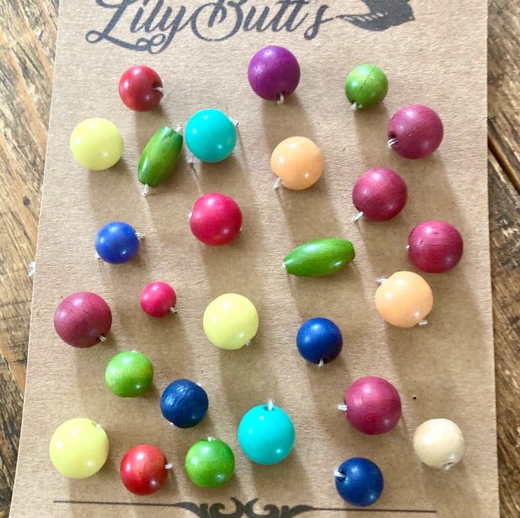 27 Vintage Multicoloured Wooden Beads, 4 different sizes, 6mm, 9mm, 12mm, 15mm, mostly round but there are 2 that are seed shaped, lovely mix! These are painted, I think these are mostly wooden, but there might be an odd plastic one in there!