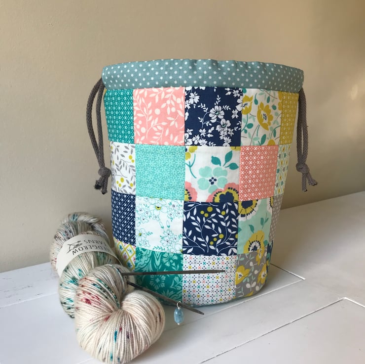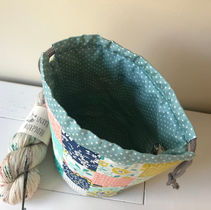 Hand crafted round based adorable little Draw string bag to keep your hand knitted socks or other small projects such as wrist warmers in.