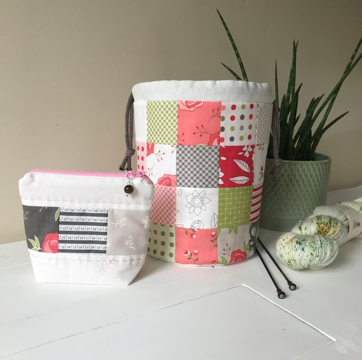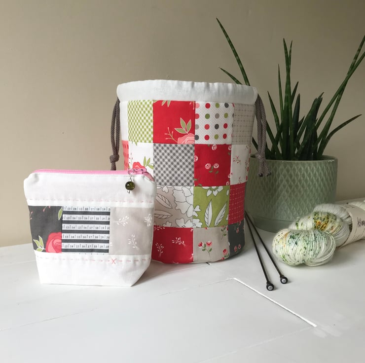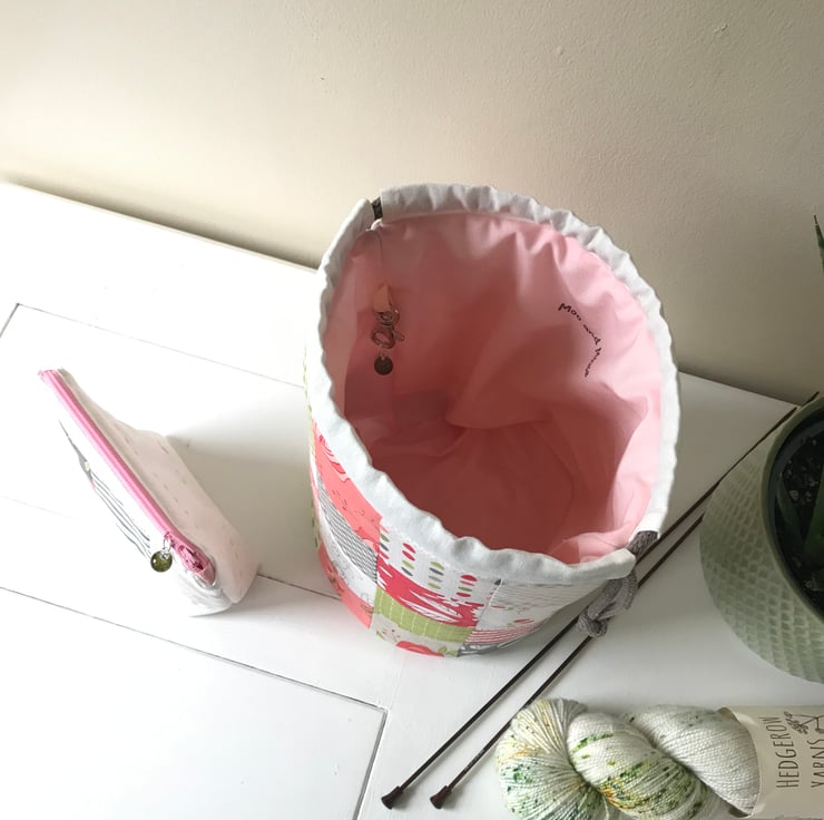 Hand crafted round based adorable little Draw string bag to keep your hand knitted socks or other small projects such as wrist warmers in.