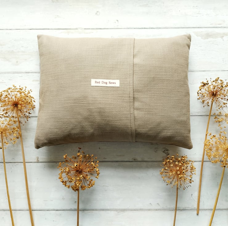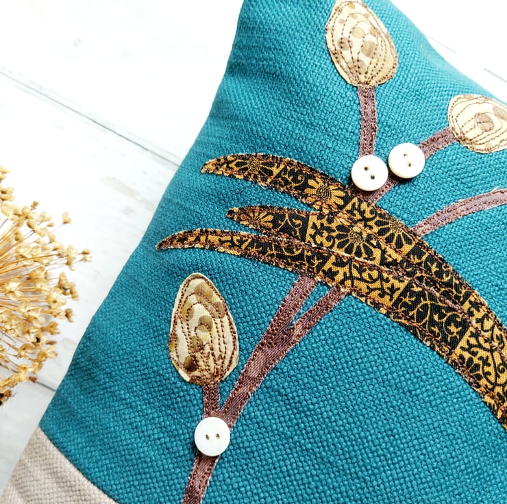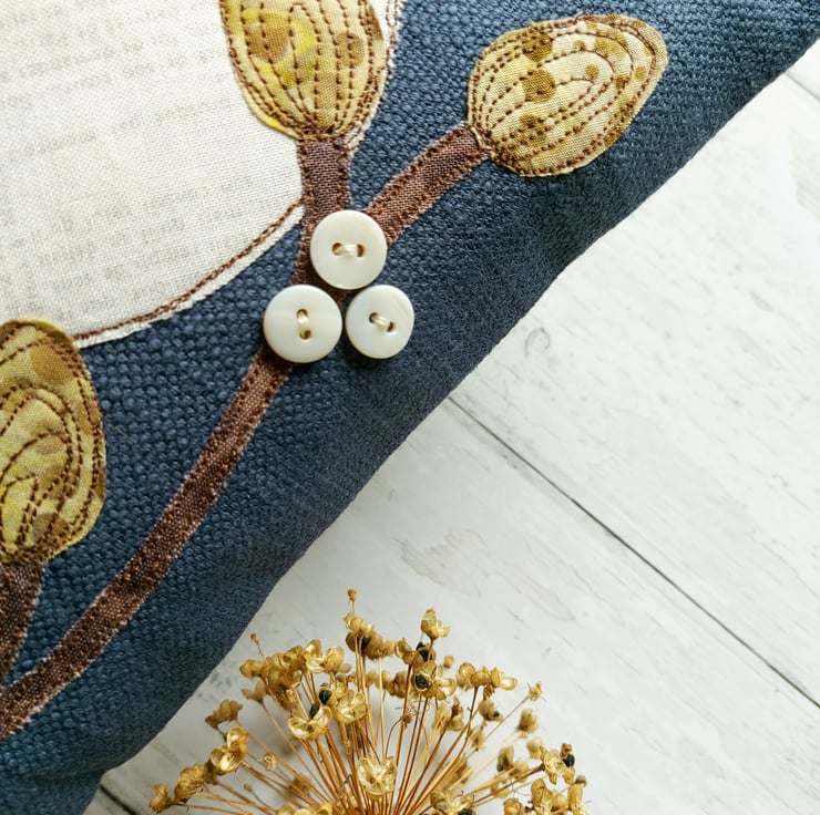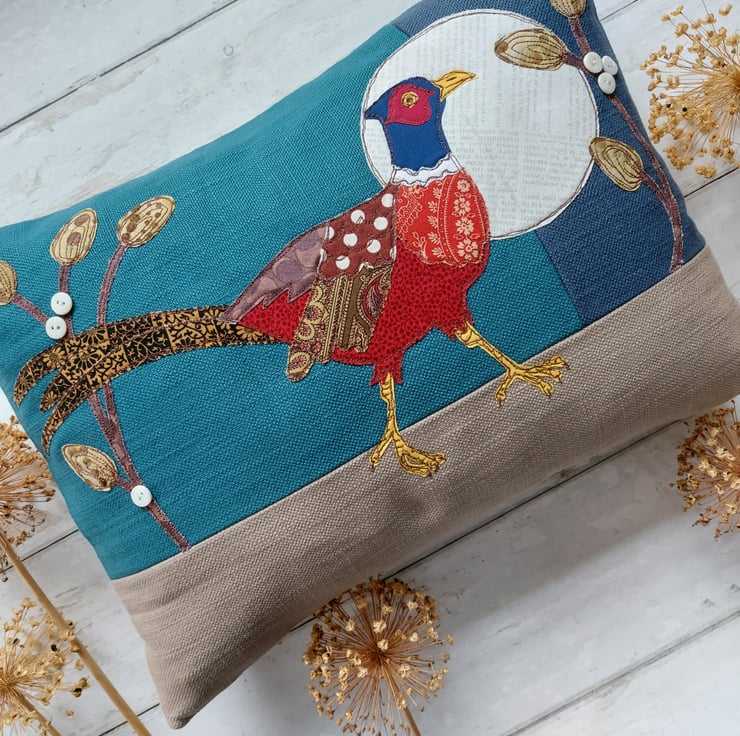 This handmade Running Pheasant Cushion has been carefully sewn using freemotion machine embroidery & applique fabrics in beautiful rich colours. Finished with buttons for berries on the foliage.