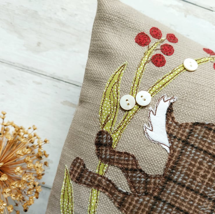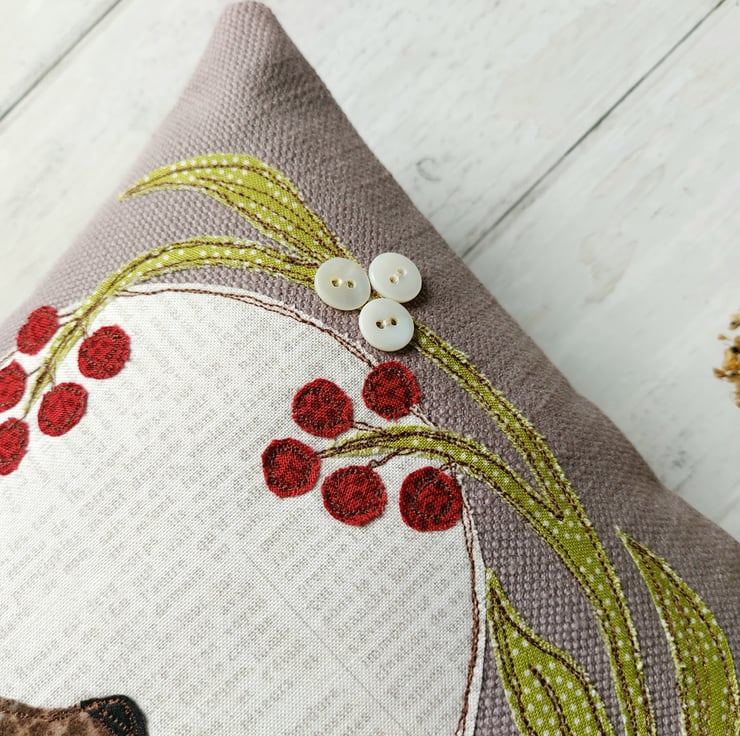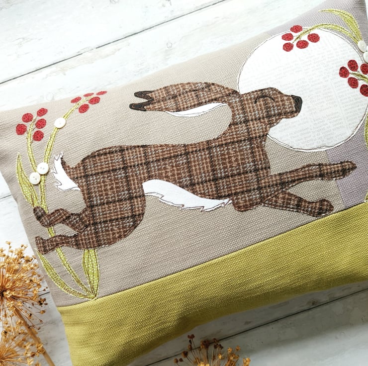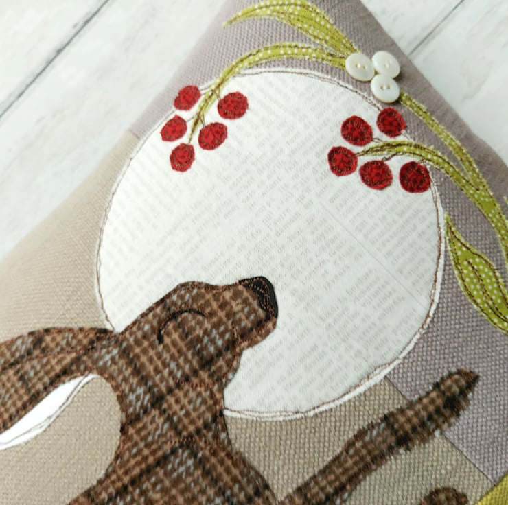 This handmade Leaping Hare Cushion has been carefully sewn using freemotion machine embroidery & applique fabrics in beautiful rich colours. Finished with buttons for berries on the foliage.