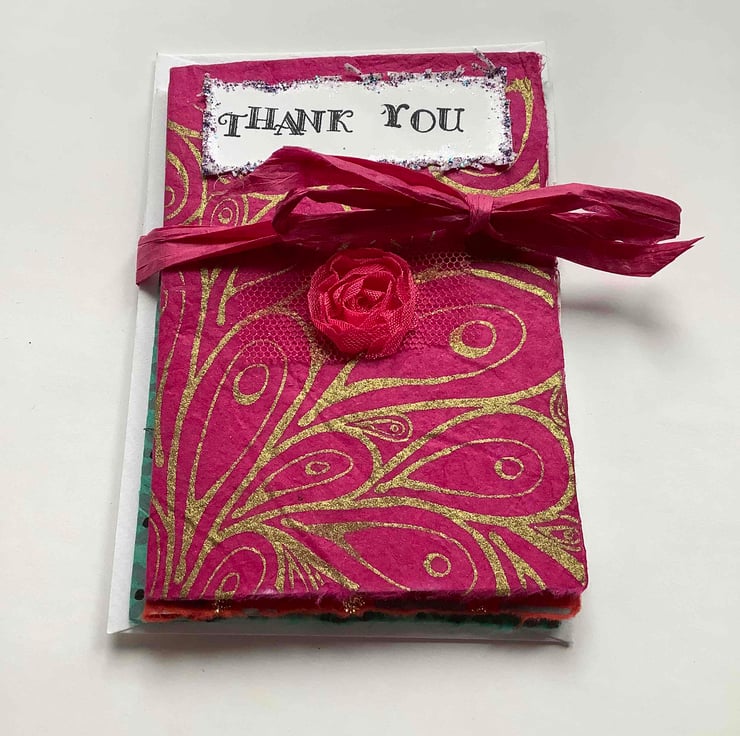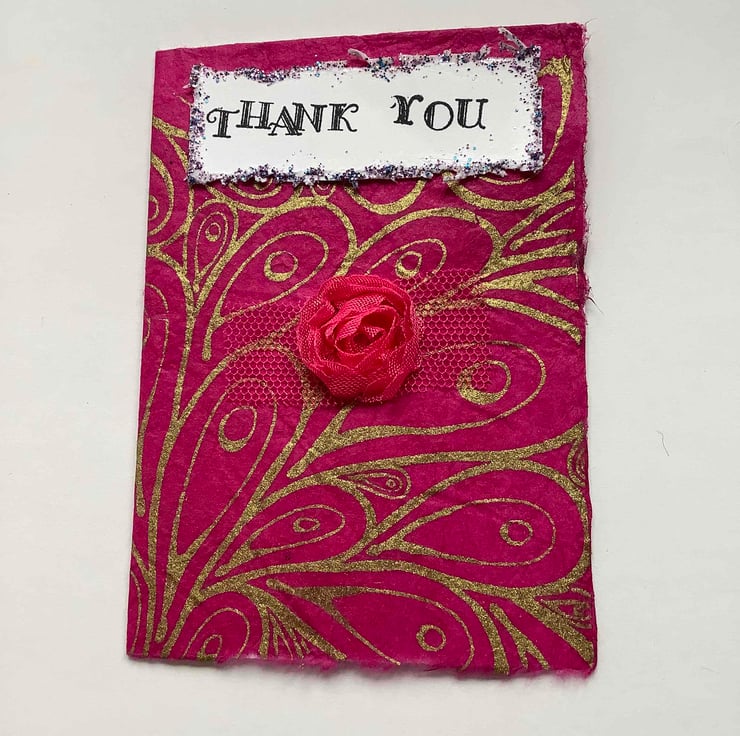 Card 1 has a cerise and gold swirl paper which has been torn at the edges for a softer look. The word THANK YOU has been stamped in black ink with a hint of purple shimmer.